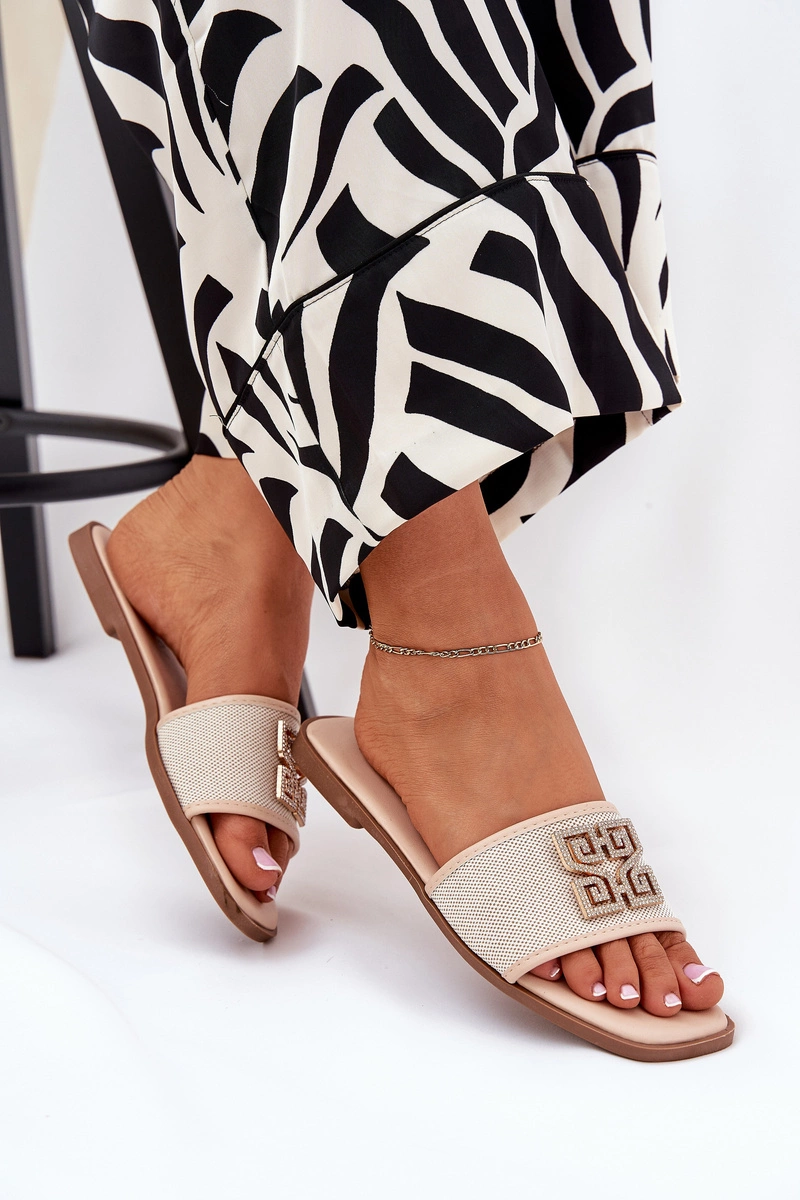 Eleganckie Klapki Damskie Z Ozdobą Na Płaskim Obcasie Beżowe Lovehia