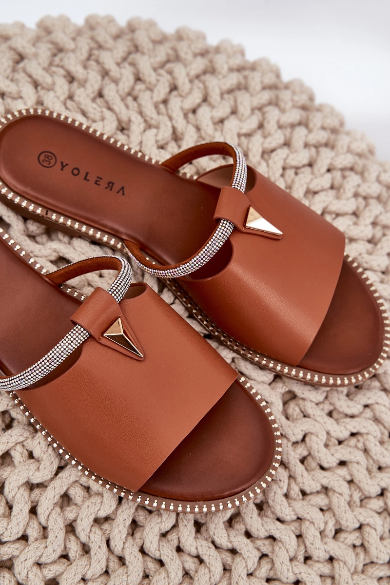 Eko Skórzane Klapki Na Płaskim Obcasie Z Ozdobnym Paseczkiem Camel Hirtewi