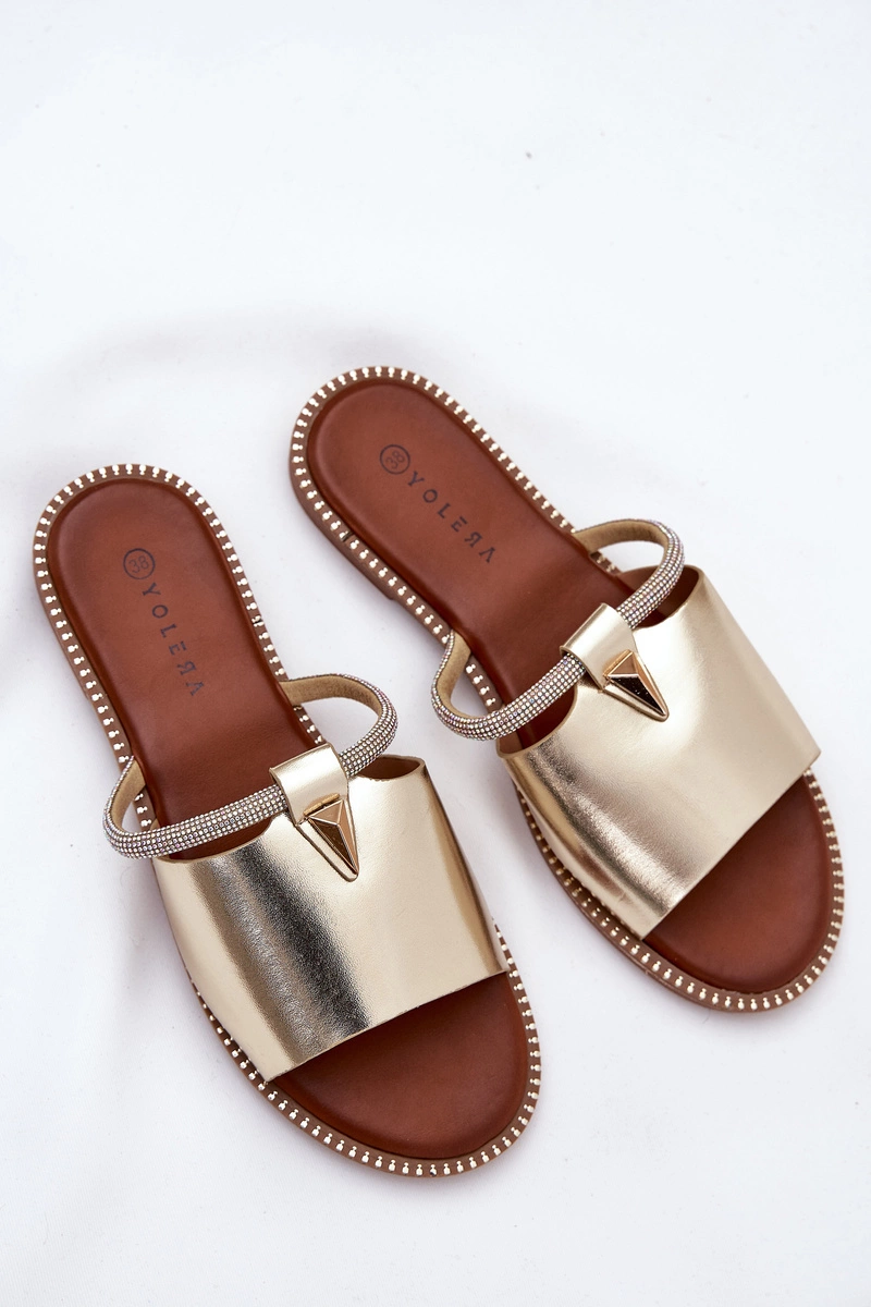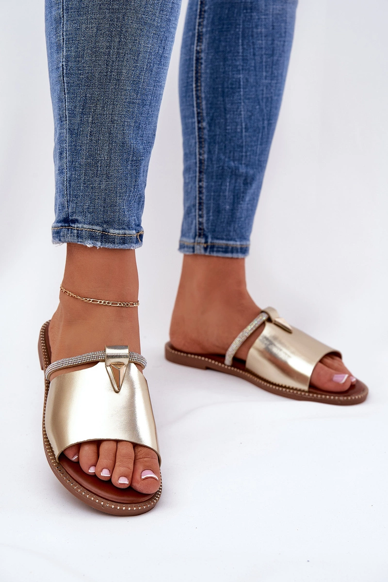 Eko Skórzane Klapki Na Płaskim Obcasie Z Ozdobnym Paseczkiem Złote Hirtewi