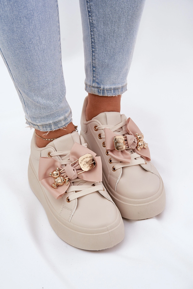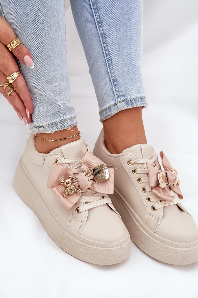 Buty sportowe damskie wykonane z eko skóry. Osadzone na platformie, zapewniają lekkość i stabilność. Sznurowanie butów ozdobione jest odpinaną kokardką, która dodaje im uroku, a do tego broszka z misiem oraz napis, wprowadzają subtelną nutę zabawy i oryginalności. Te sneakersy będą doskonałym wyborem do codziennych, casualowych stylizacji, łącząc wygodę z unikalnym stylem. Przy wyborze rozmiaru prosimy kierować się tabelą rozmiarów.