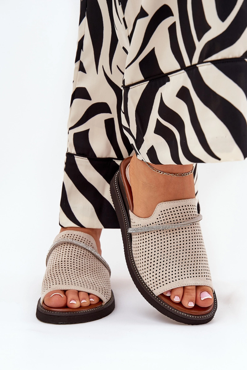 Klapki Damskie Na Koturnie Z Ozdobnym Paseczkiem Beżowe Teriwes