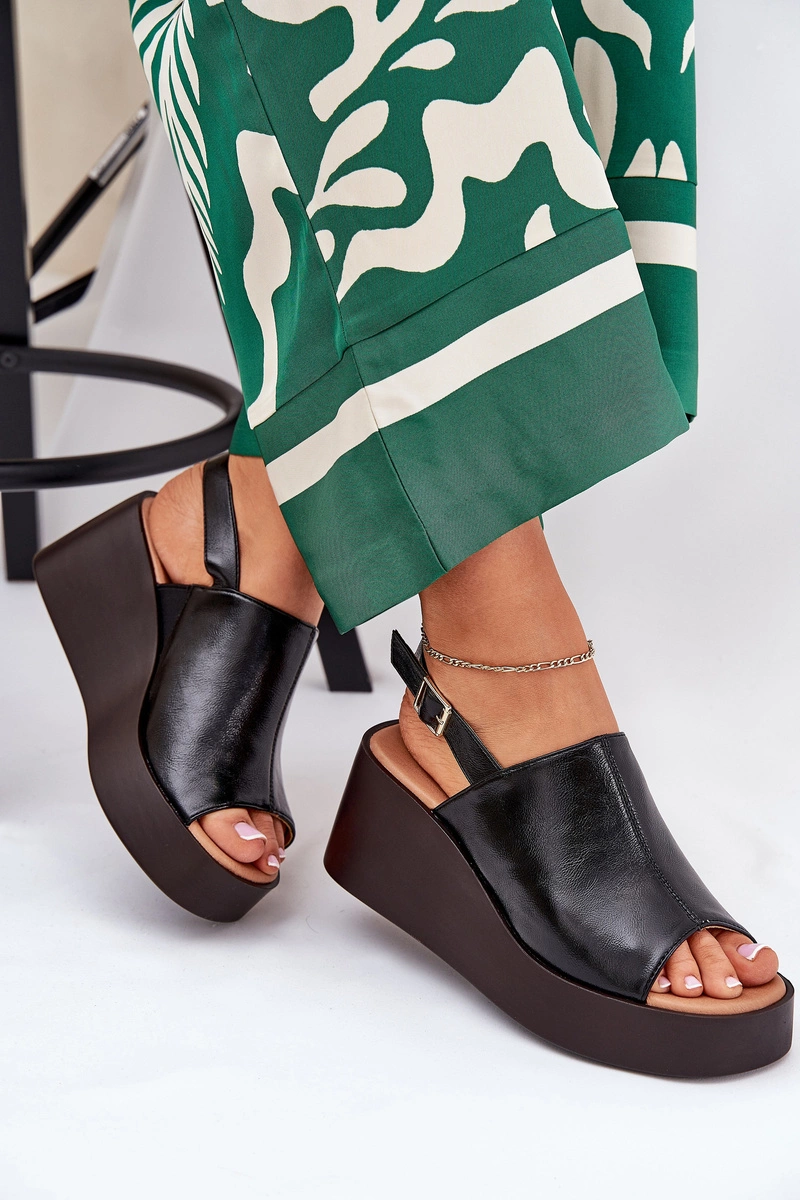 Sandały Damskie Z Eko Skóry Na Platformie I Koturnie Czarne Leaniria