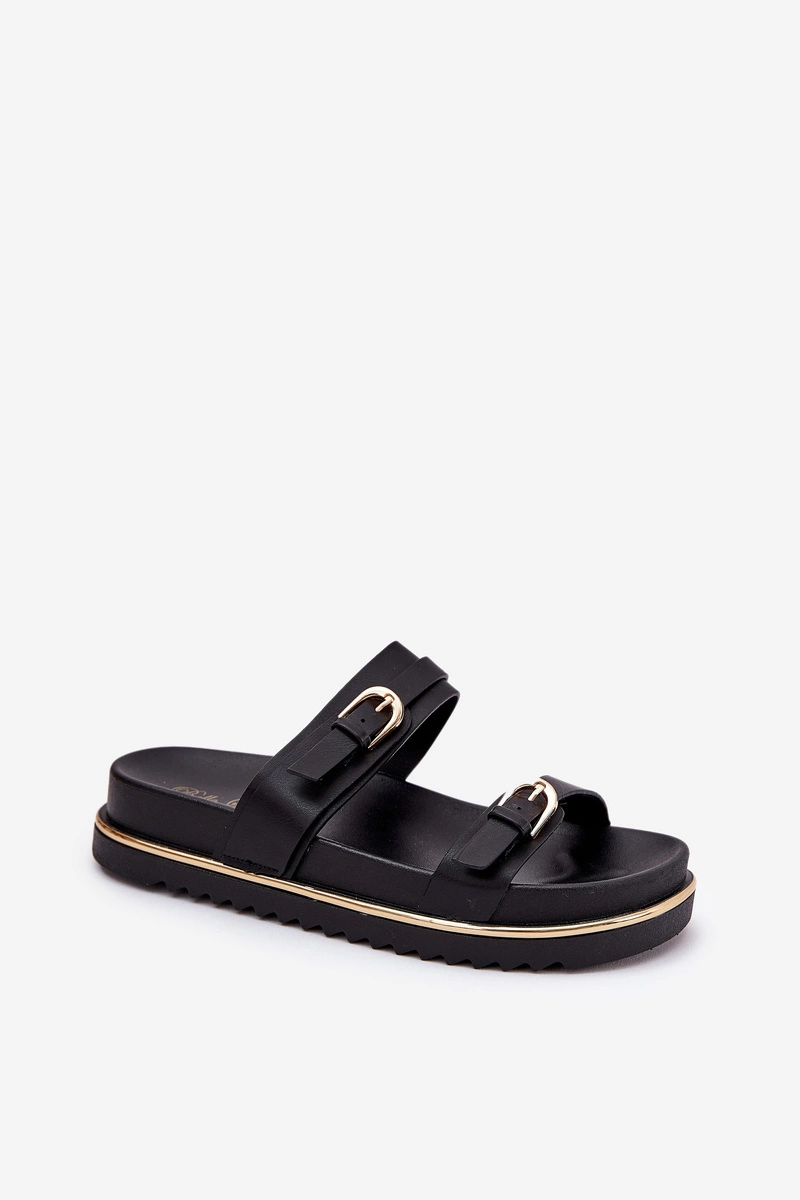 Klapki Damskie Gładkie Na Platformie Z Paskami I Klamrami Czarne Ziferte