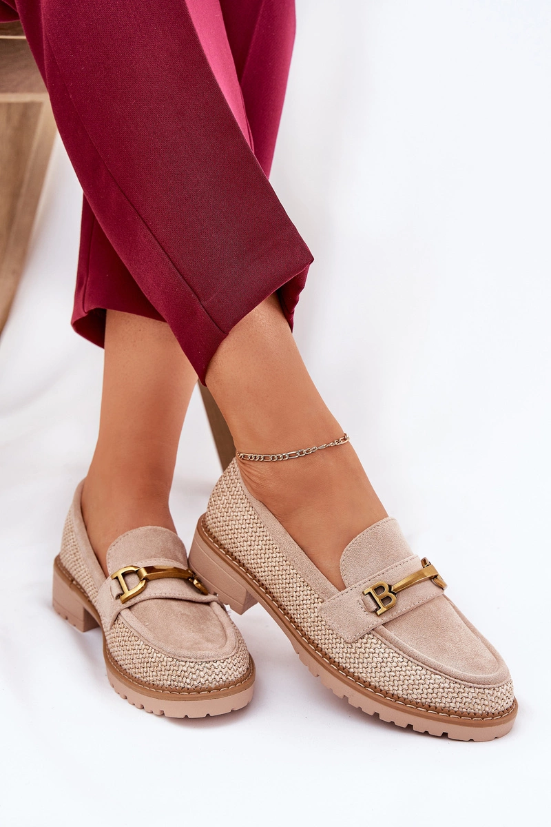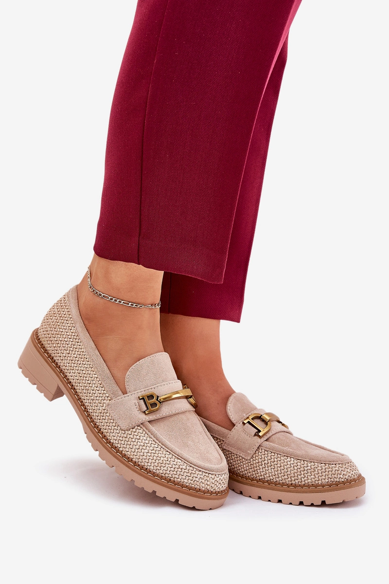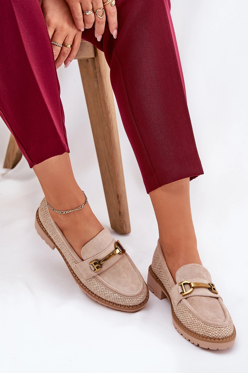 Mokasyny Damskie Z Plecionką I Złotym Detalem Beżowe Seffolia