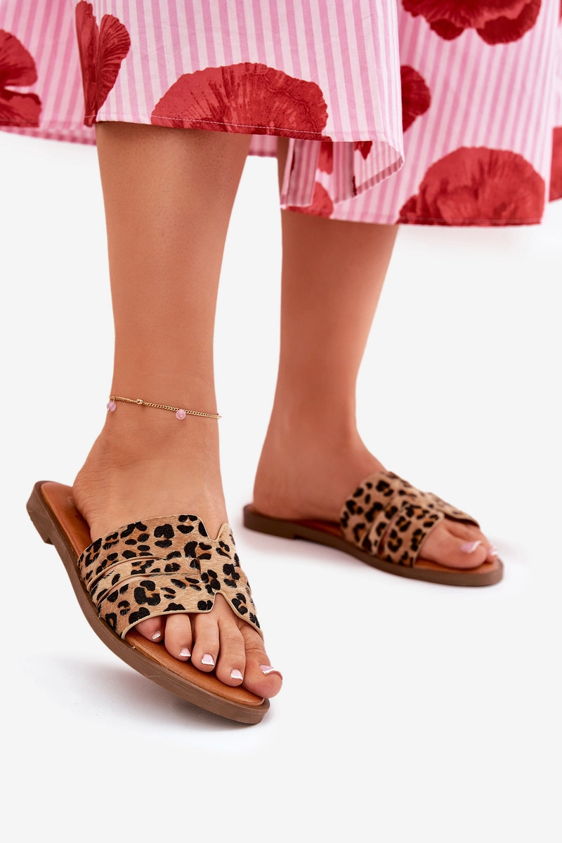 Klapki Damskie Na Płaskim Obcasie Z Wycięciami Panterka Brązowe Teterre