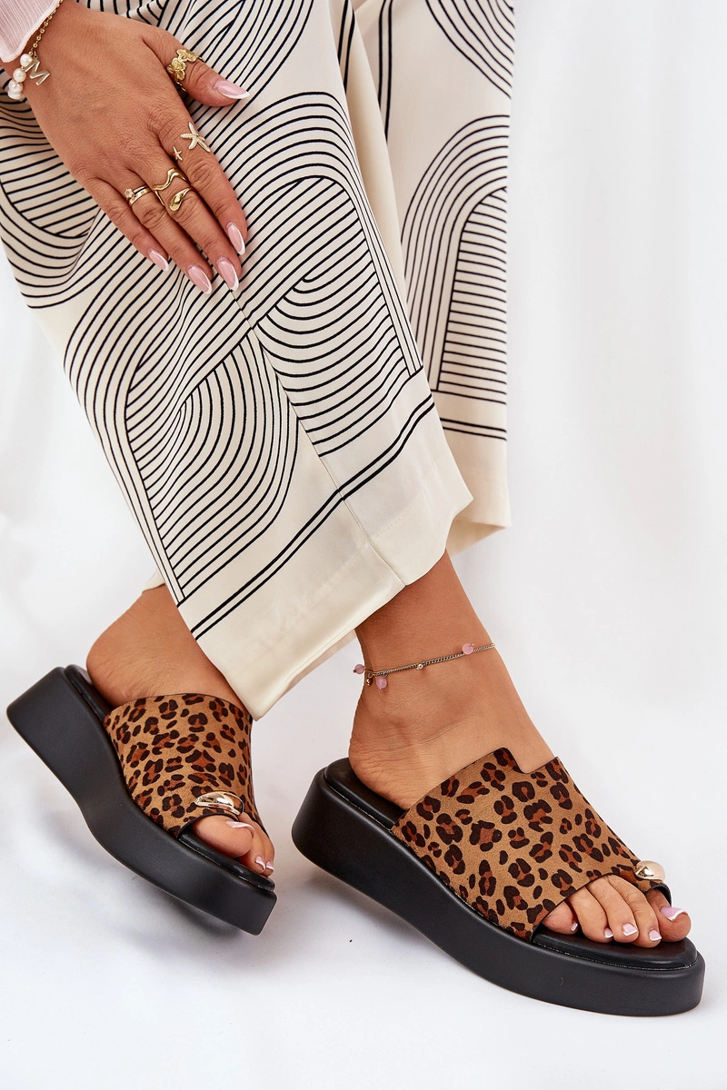 Klapki Damskie Na Platformie I Niskim Koturnie Z Ozdobnym Detalem Panterka Brązowe Saqesse
