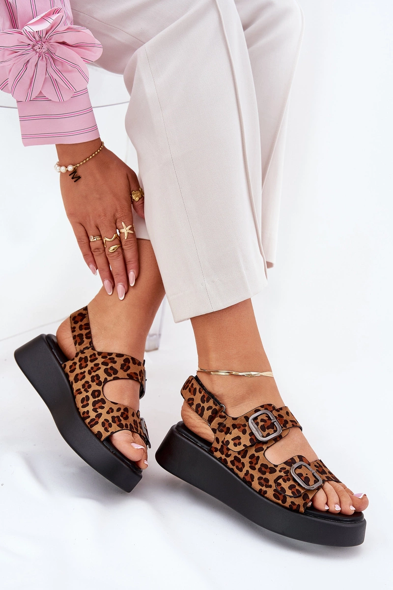 Sandały Damskie Na Platformie I Koturnie Z Klamrami Panterka Brązowe Genorre
