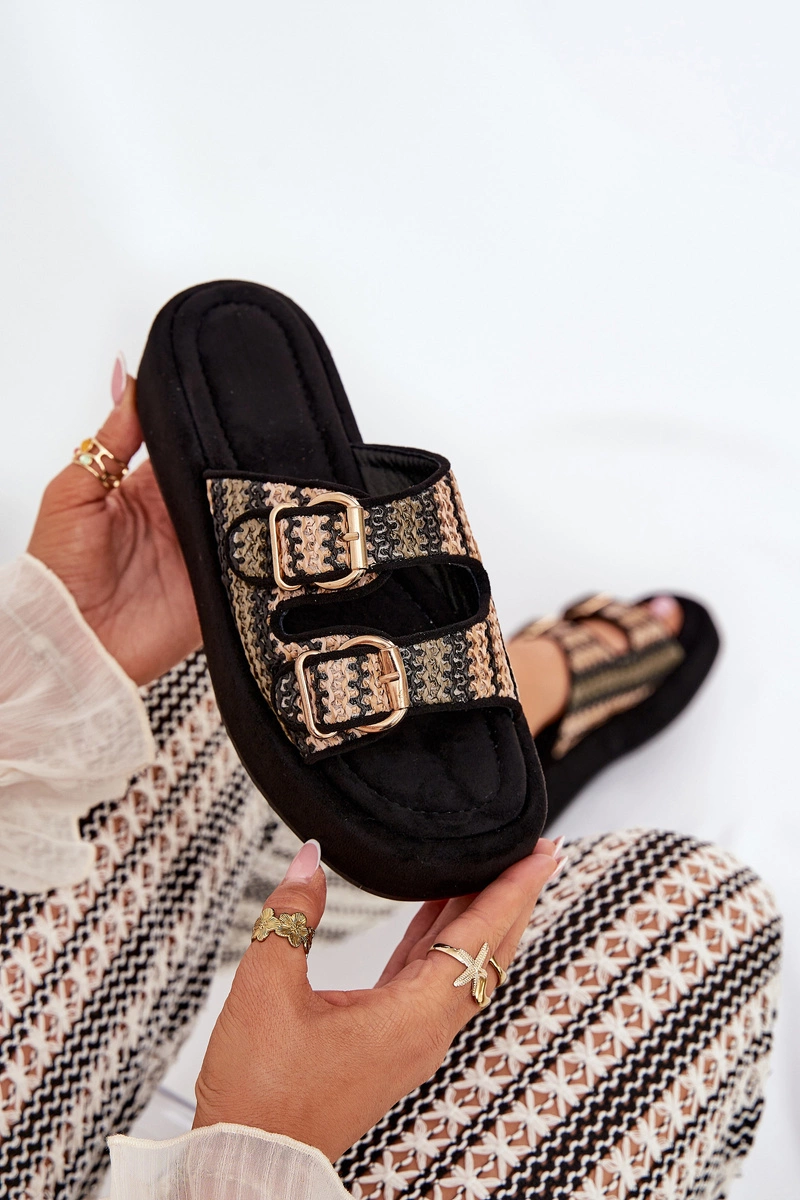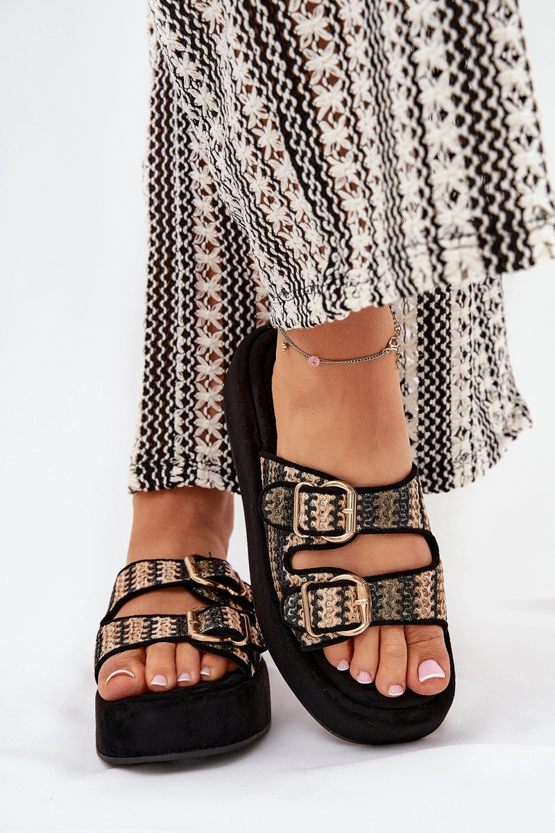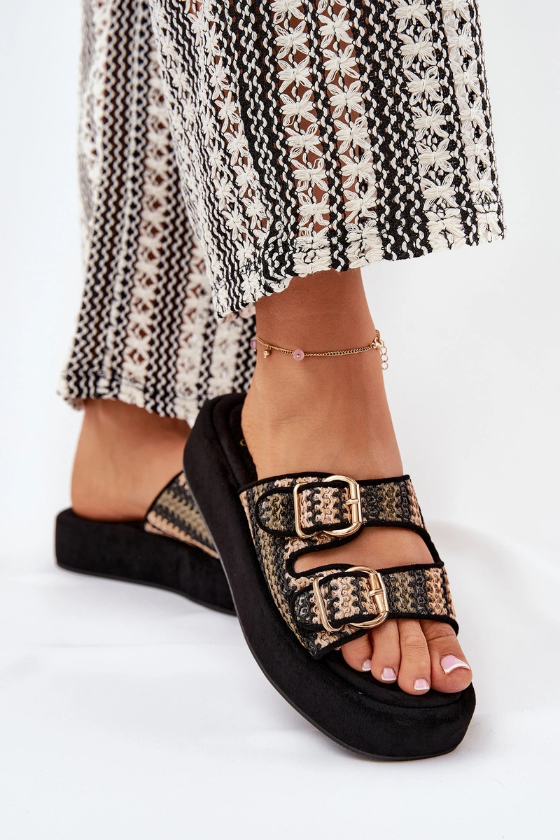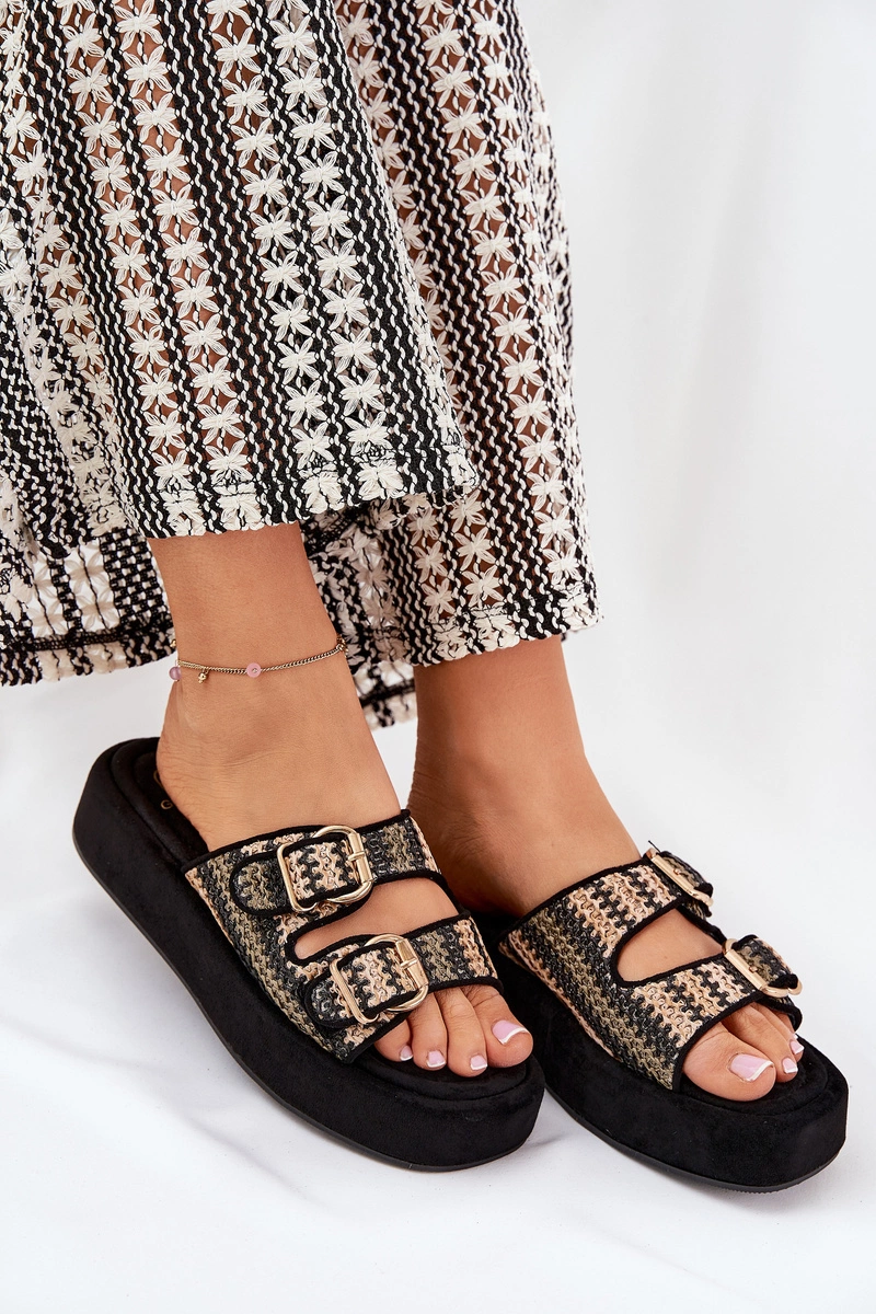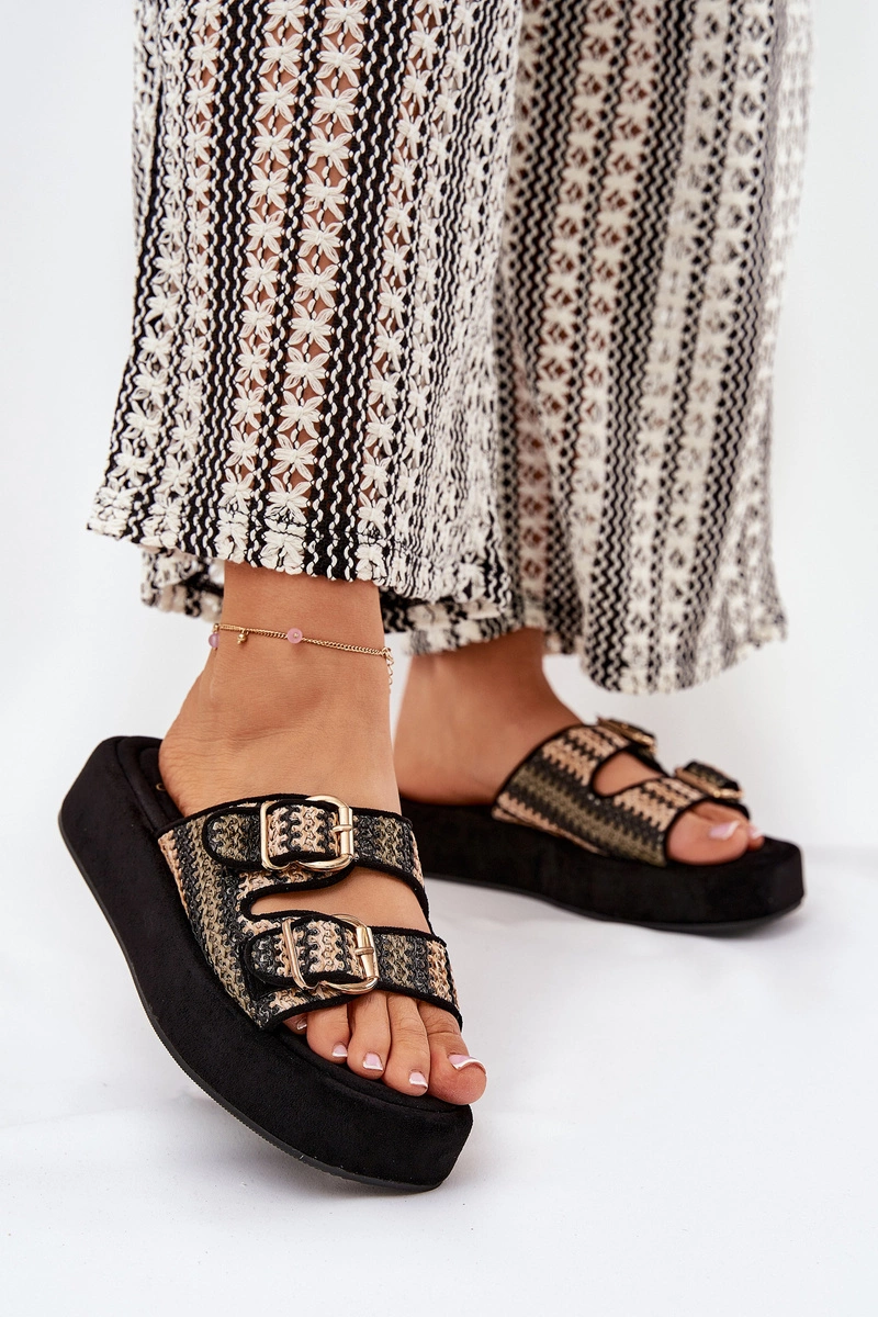 Klapki Damskie Na Platformie Z Klamrami I Plecionką Czarne Limme