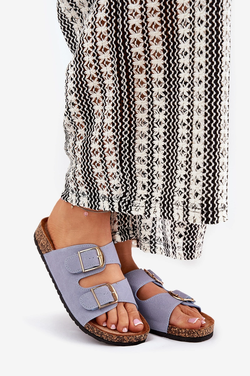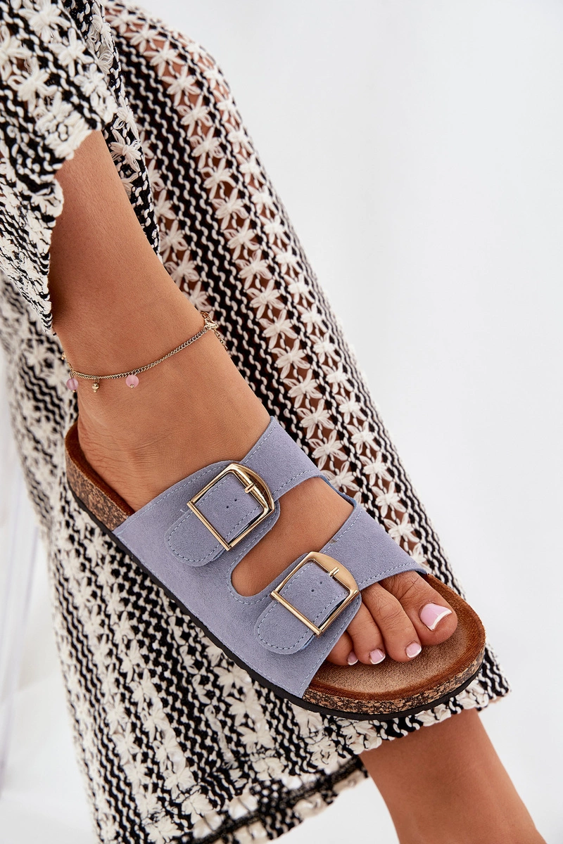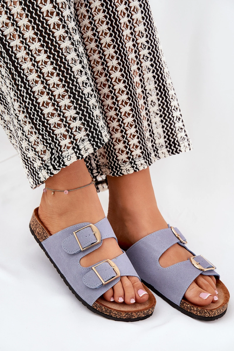 Klapki Damskie Na Korkowej Platformie Ze Złotymi Klamrami Niebieskie Lisavionea