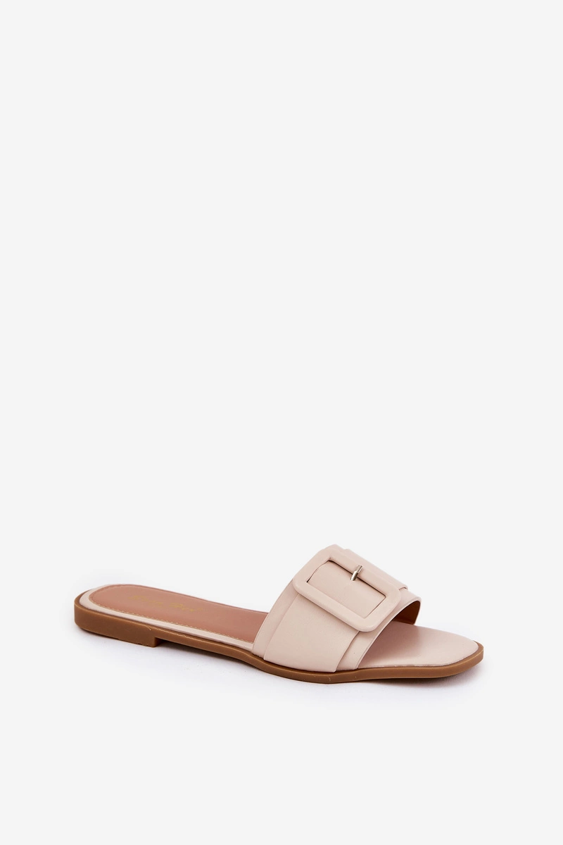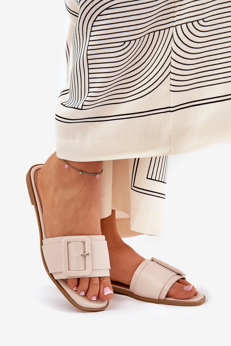 Płaskie Klapki Damskie Eko Skórzane Z Klamrą Beżowe Bamma