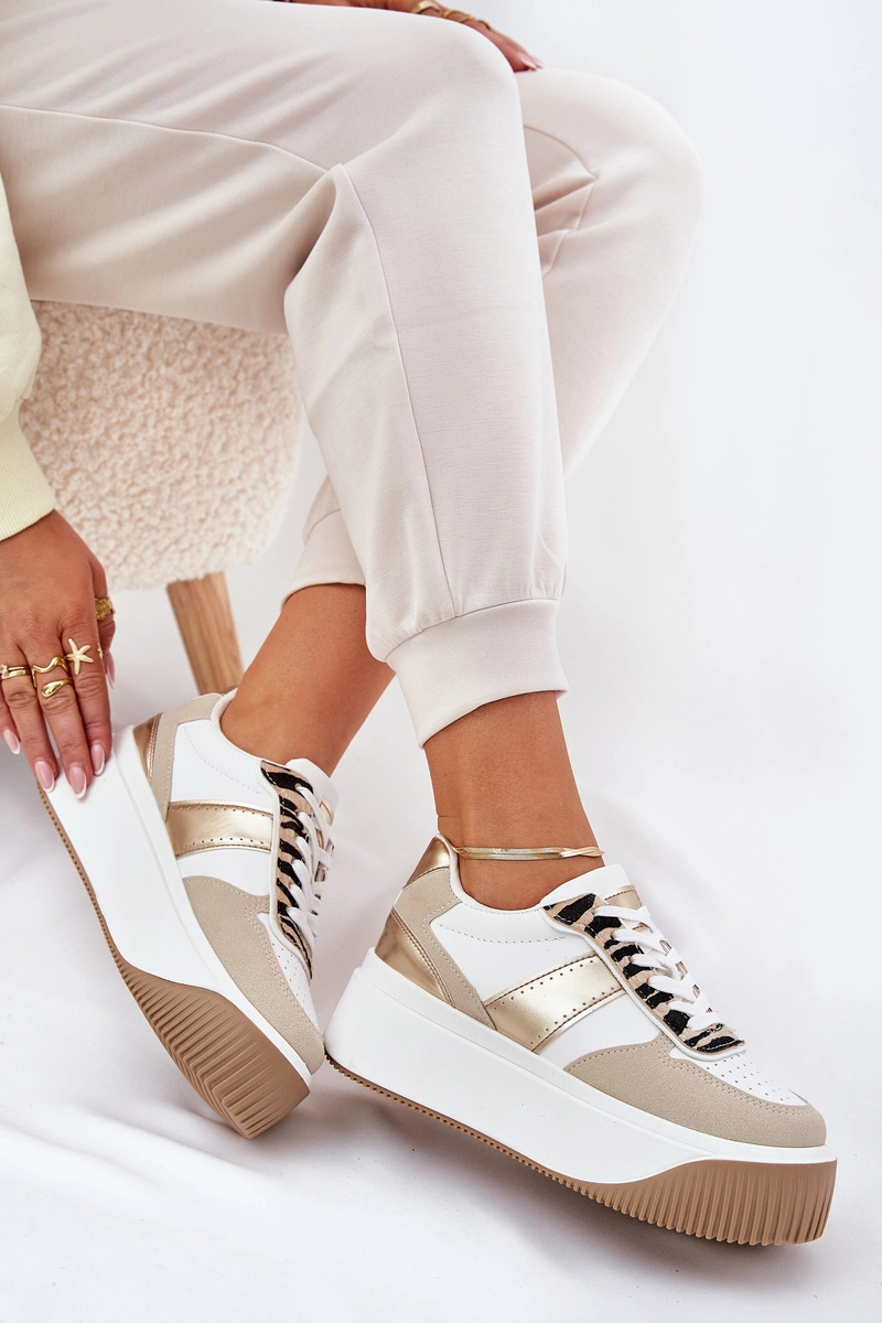 Sneakersy Damskie Na Masywnej Platformie Zwierzęcy Wzór Beżowo-Złote Telanila