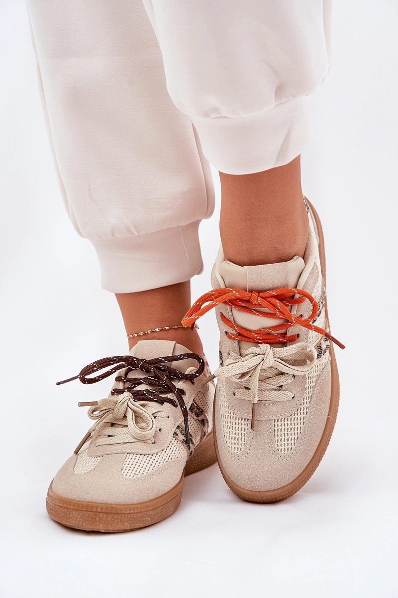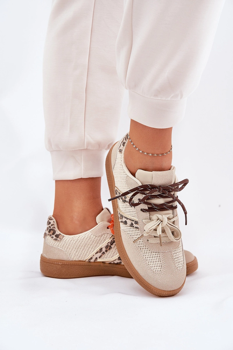 Sneakersy Damskie Z Podwójnym Sznurowaniem Panterka Beżowe Ollabes
