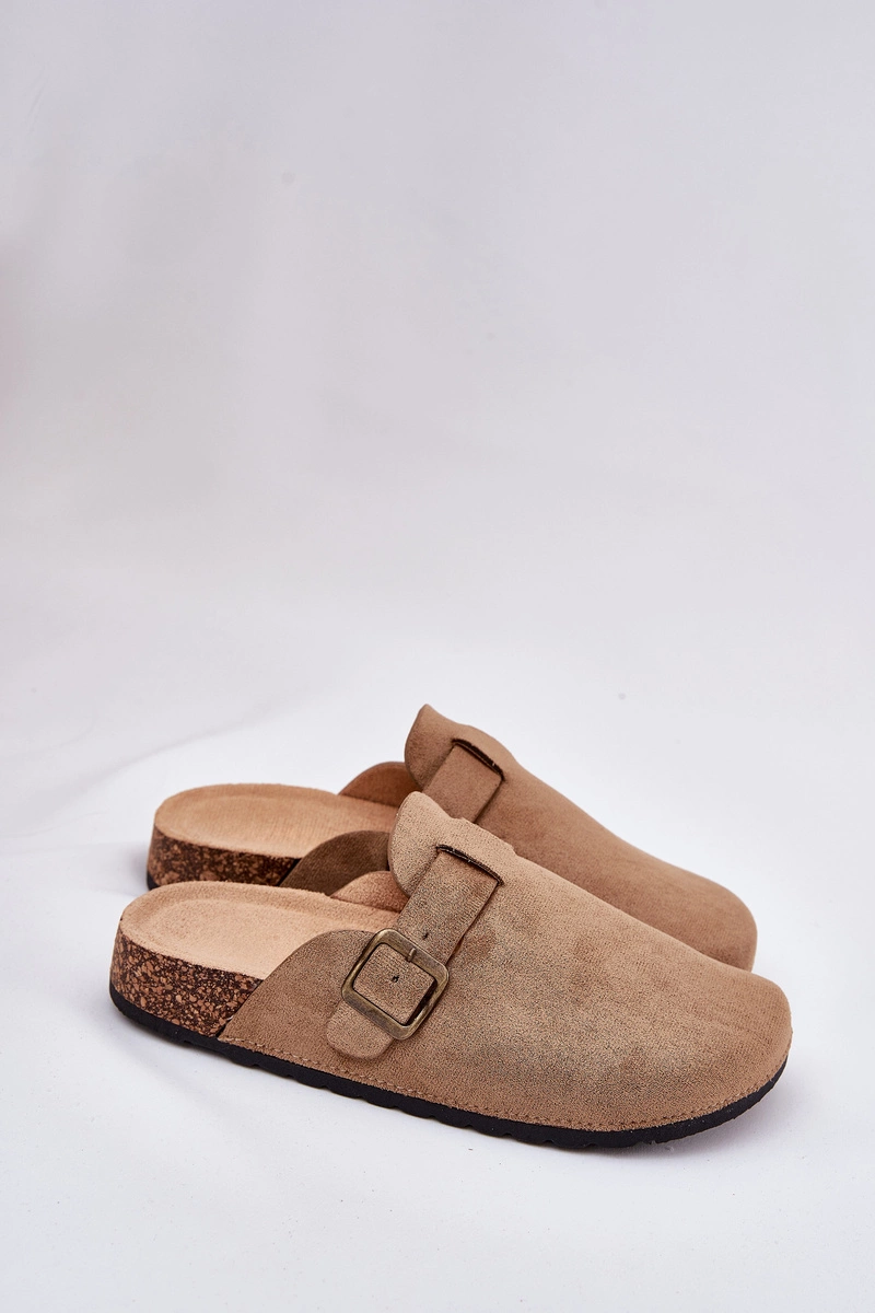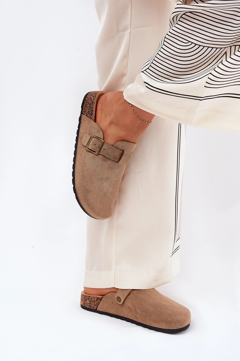 Damskie klapki chodaki na korkowej platformie. Wykonane z eko zamszu. Noski zakryte zapewniają większą ochronę, a klamra umożliwia idealne dopasowanie do stopy. Profilowana wkładka gwarantuje komfort przez cały dzień, dbając o odpowiednie wsparcie. Te klapki będą doskonałym wyborem na co dzień, idealne do casualowych stylizacji, zapewniając wygodę i modny wygląd. Przy wyborze rozmiaru prosimy sugerować się tabelą rozmiarów.