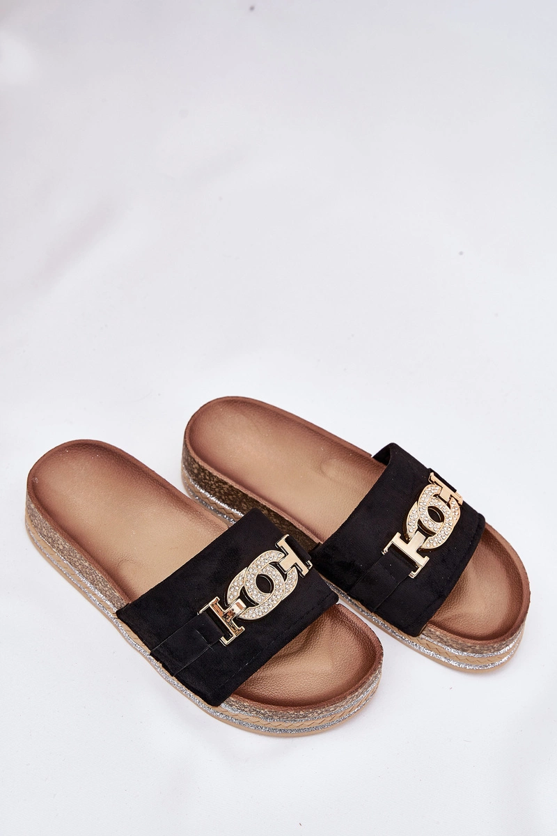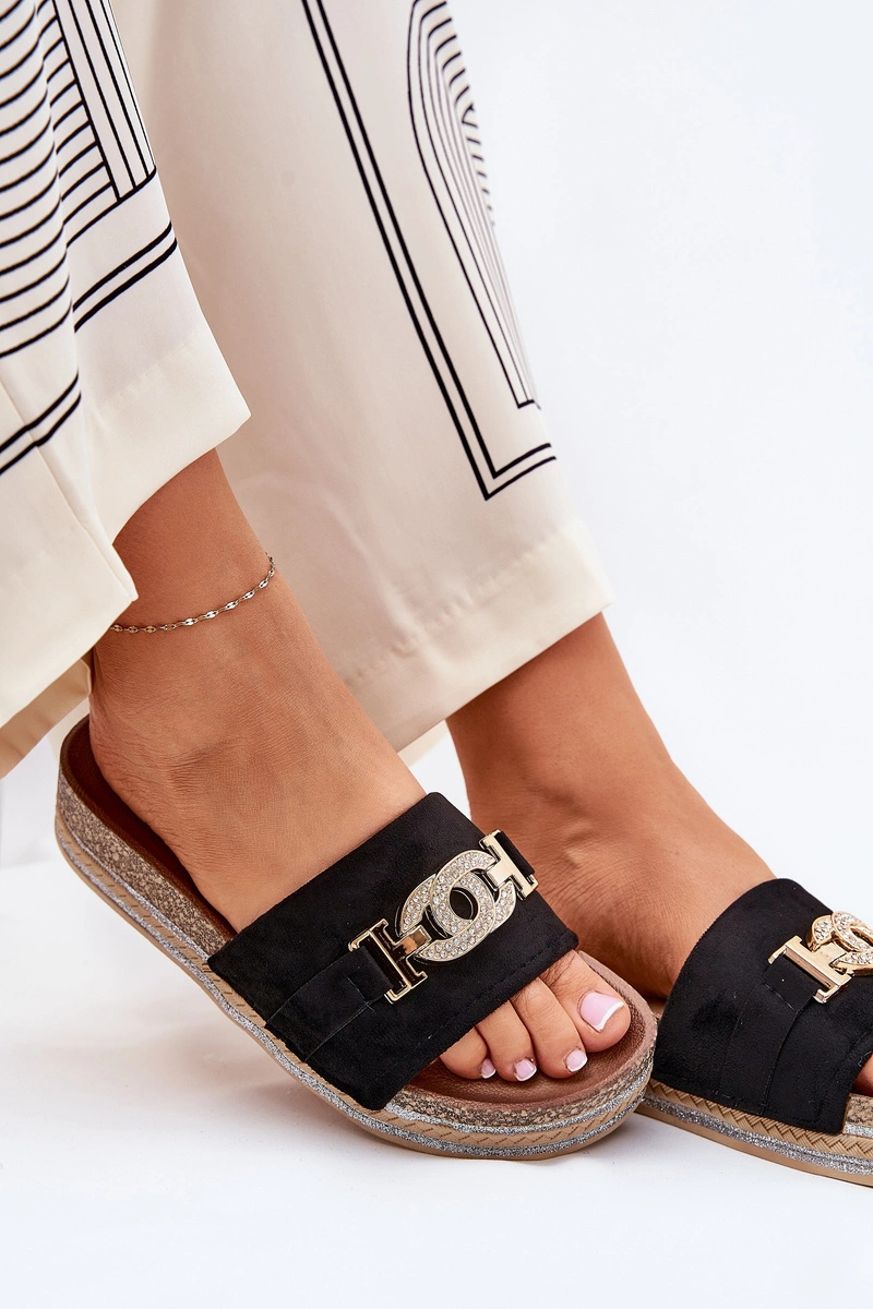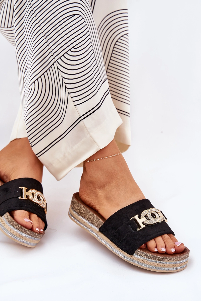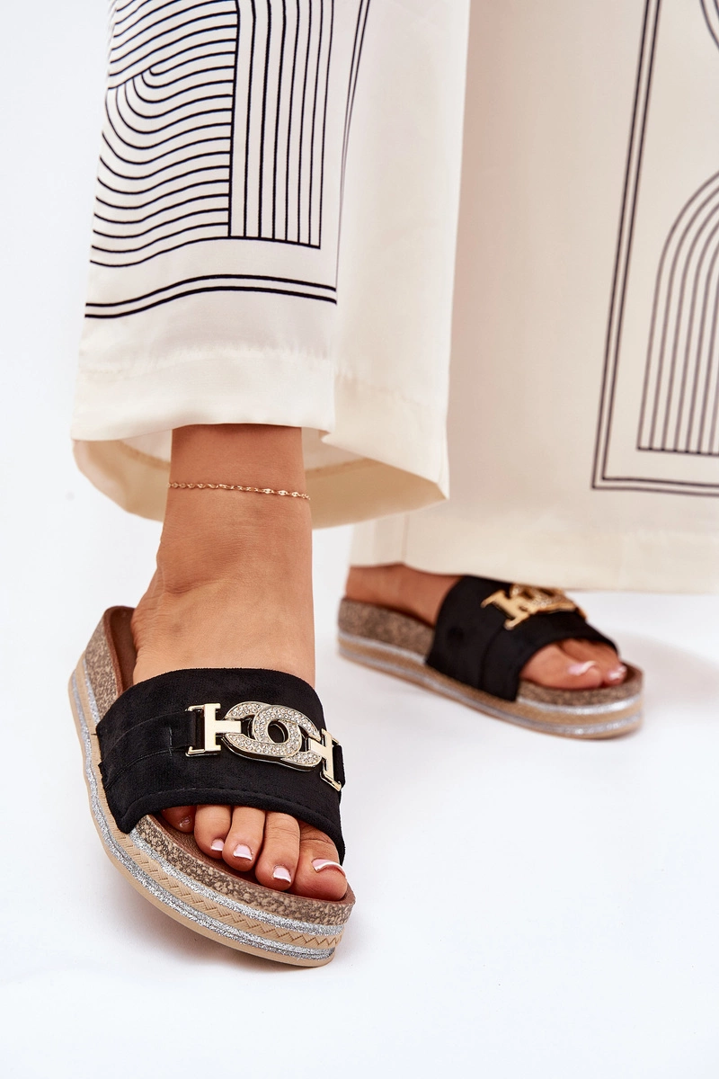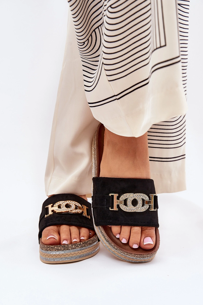 Klapki Damskie Ze Złotym Detalem Na Platformie Z Brokatem Czarne Eanes