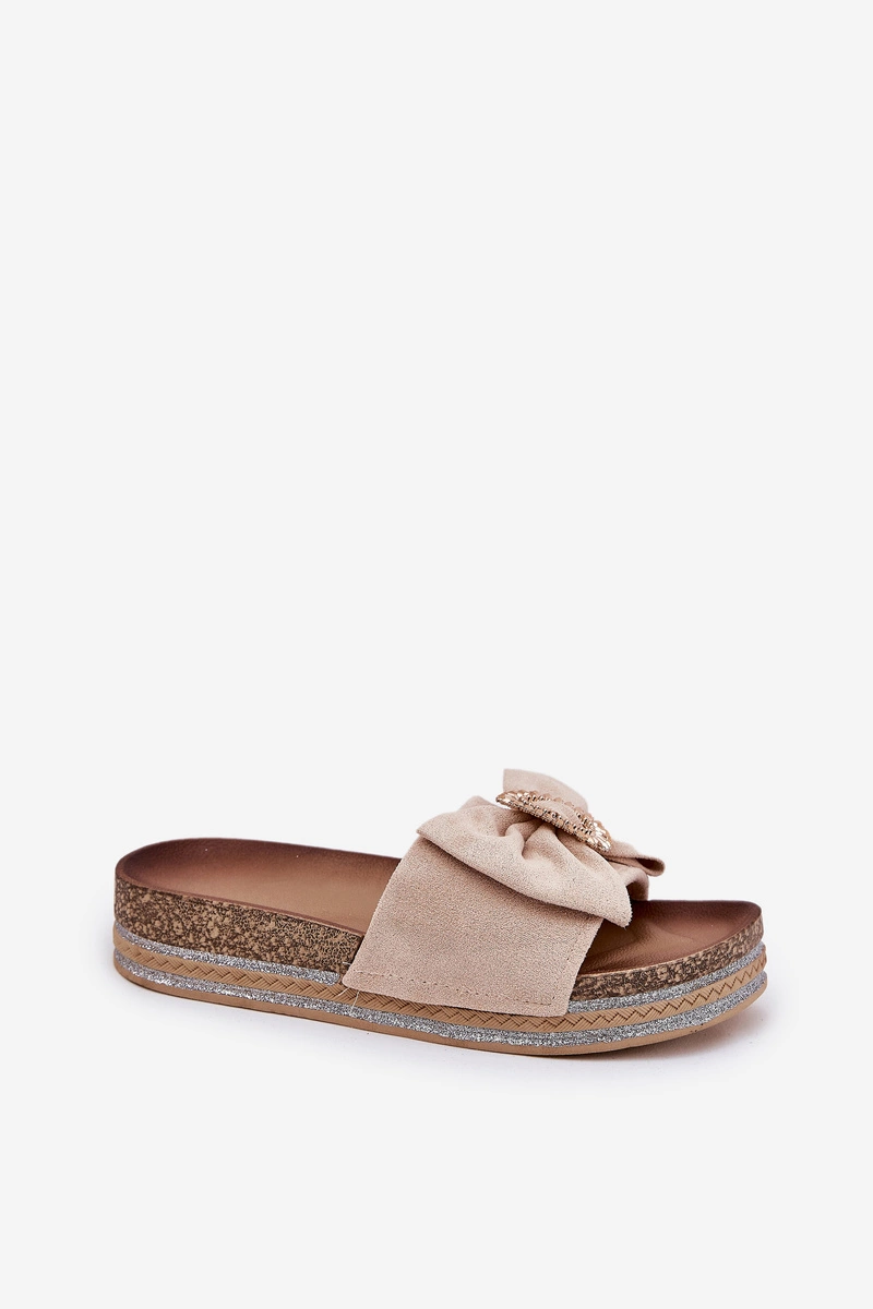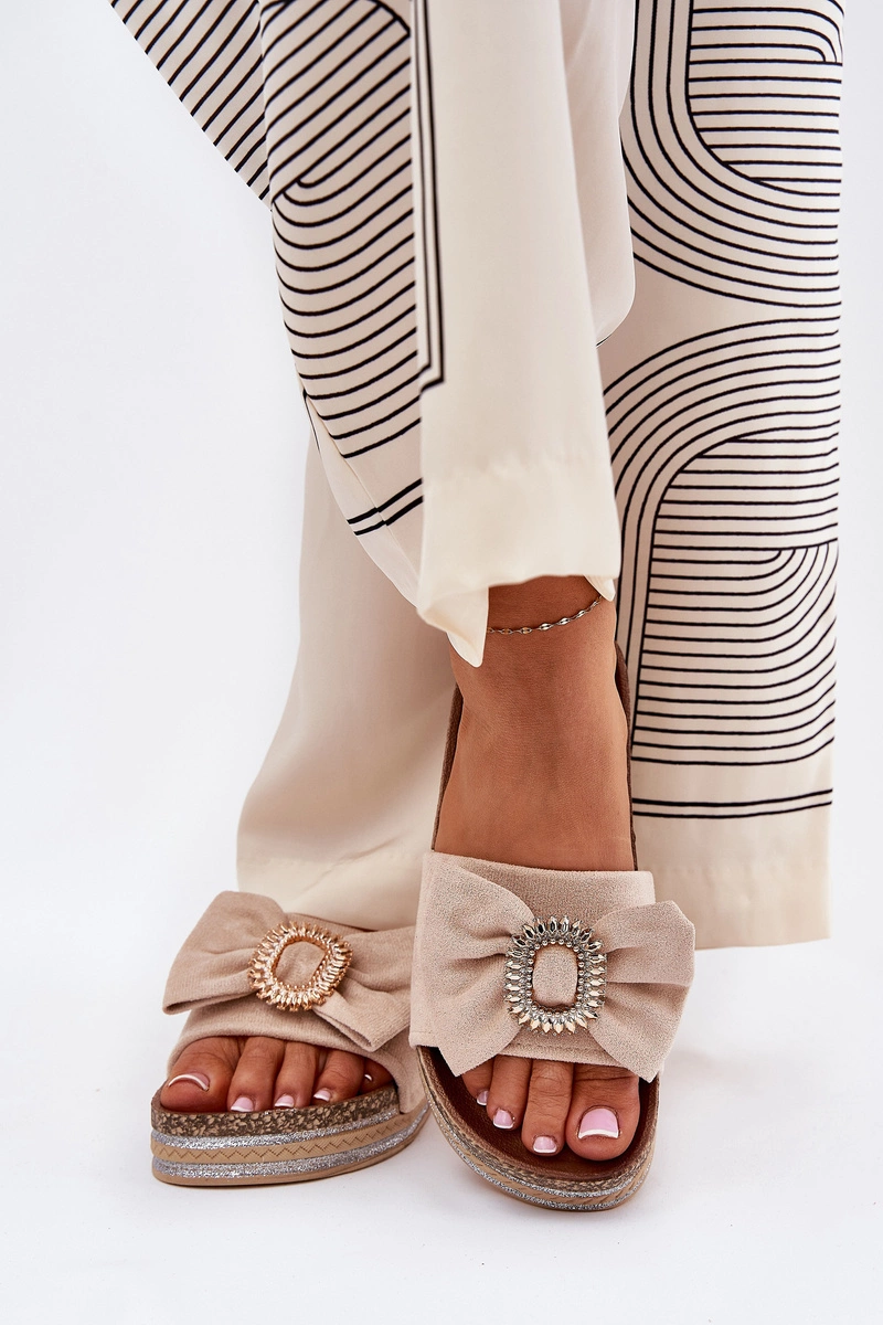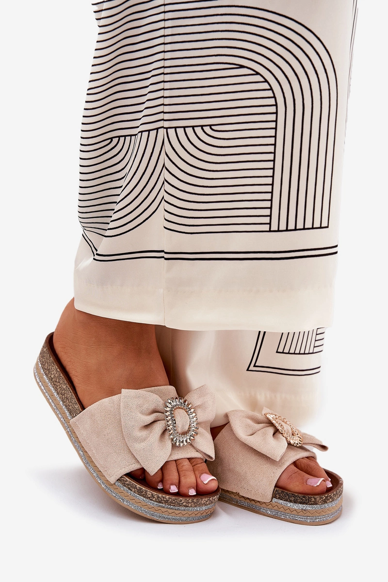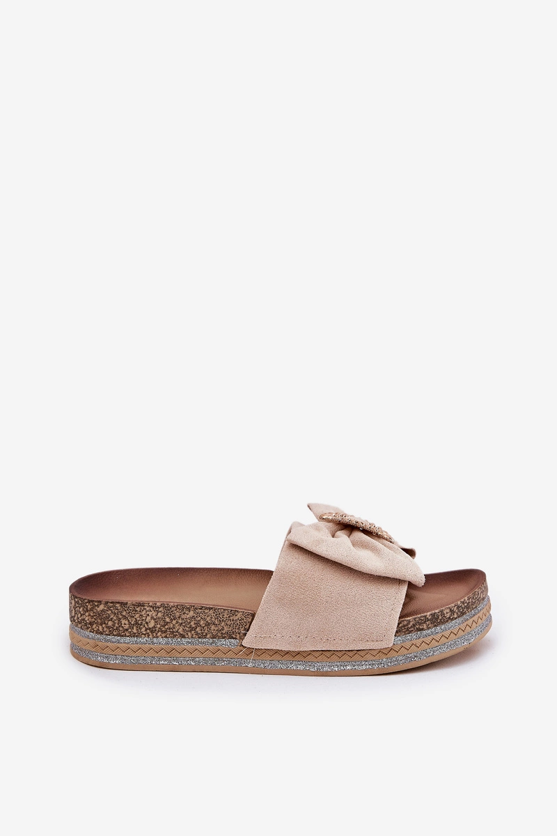 Klapki wykonane z eko zamszu. Z przodu kokardka i ozdobna broszka. Osadzone na platformie z brokatem, który wprowadza do każdej stylizacji odrobinę blasku i elegancji. Te klapki będą doskonałym wyborem na letnie dni, idealnie komponując się z sukienkami, spódnicami czy szortami, dodając każdemu lookowi nowoczesnego akcentu. Przy wyborze rozmiaru rosimy sugerować się tabelą rozmiarów.