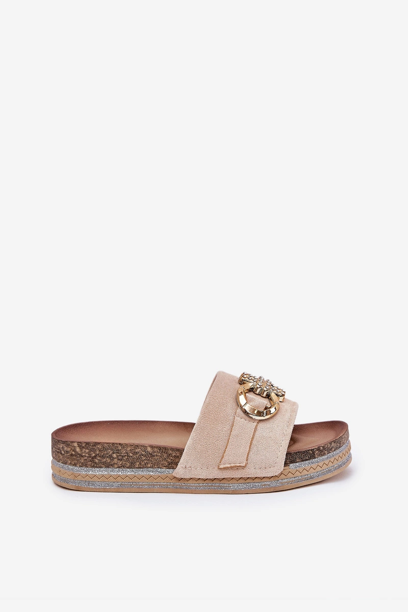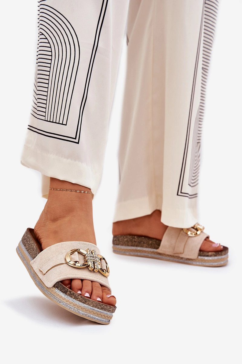 Klapki Damskie Na Platformie Z Brokatem I Złotą Ozdobą Beżowe Rilirea