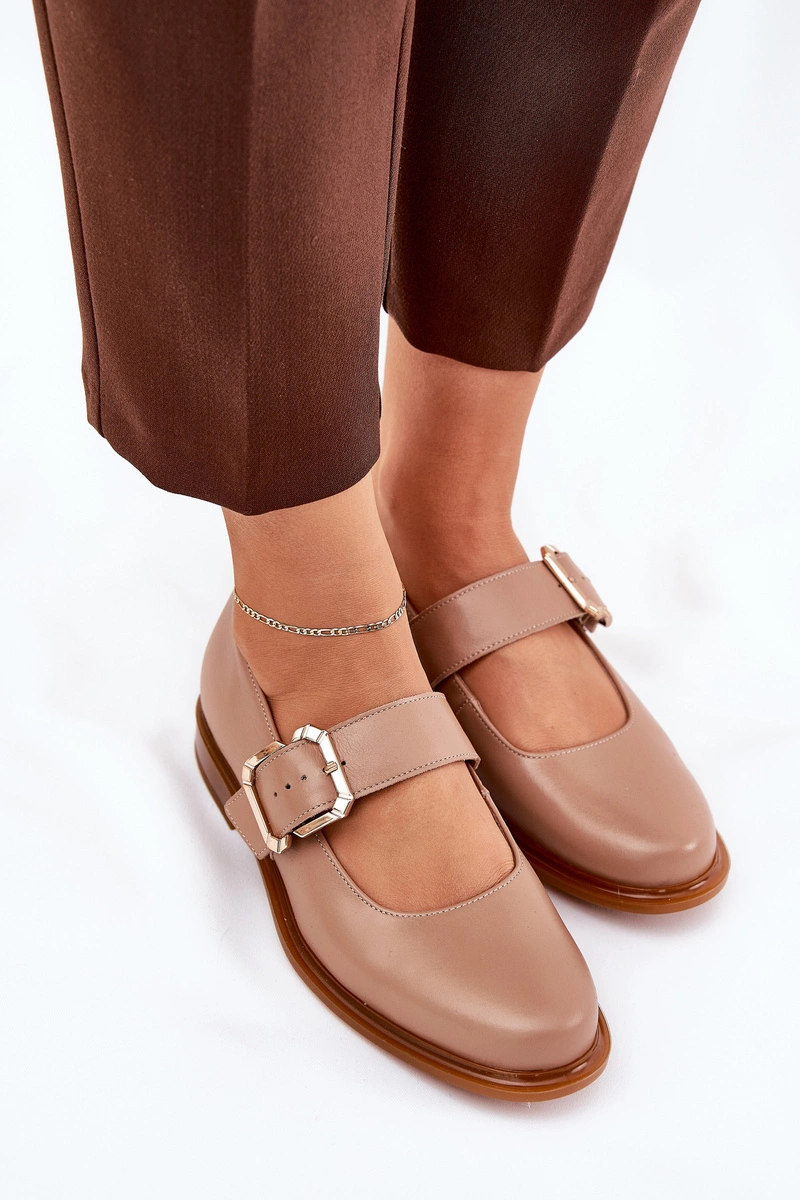 Skórzane Półbuty Damskie Z Klamrą Laura Messi 2980 Ciemnobeżowe