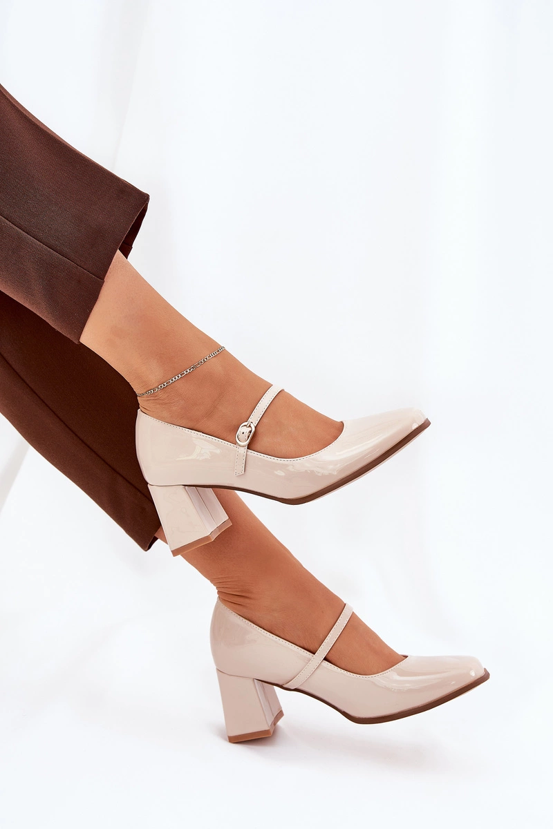 Lakierowane Czółenka Na Słupku Z Paskiem I Sprzączką Beżowe Tammirea