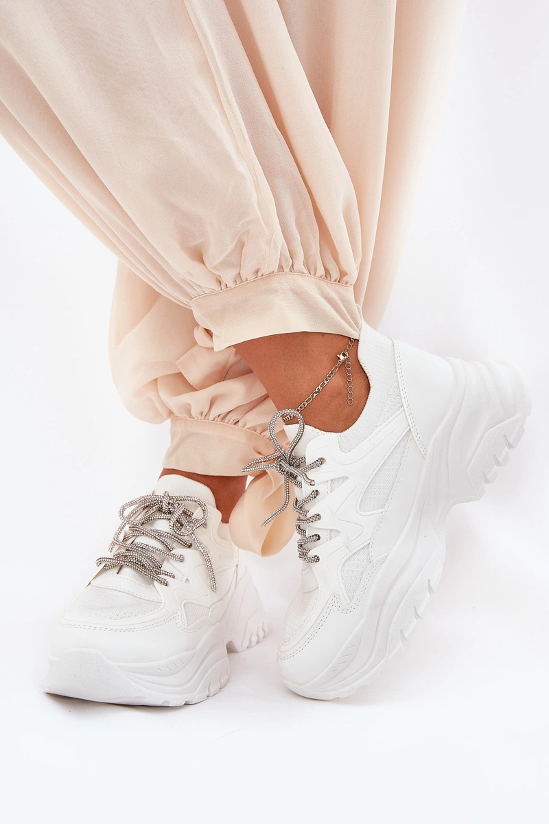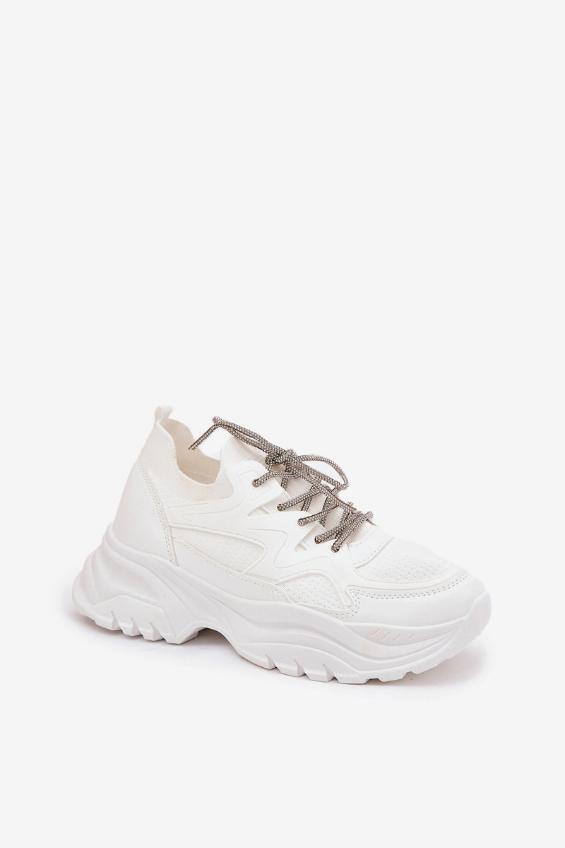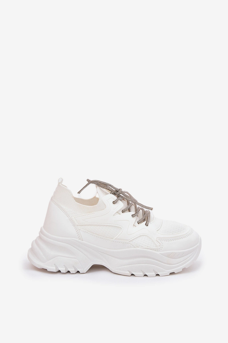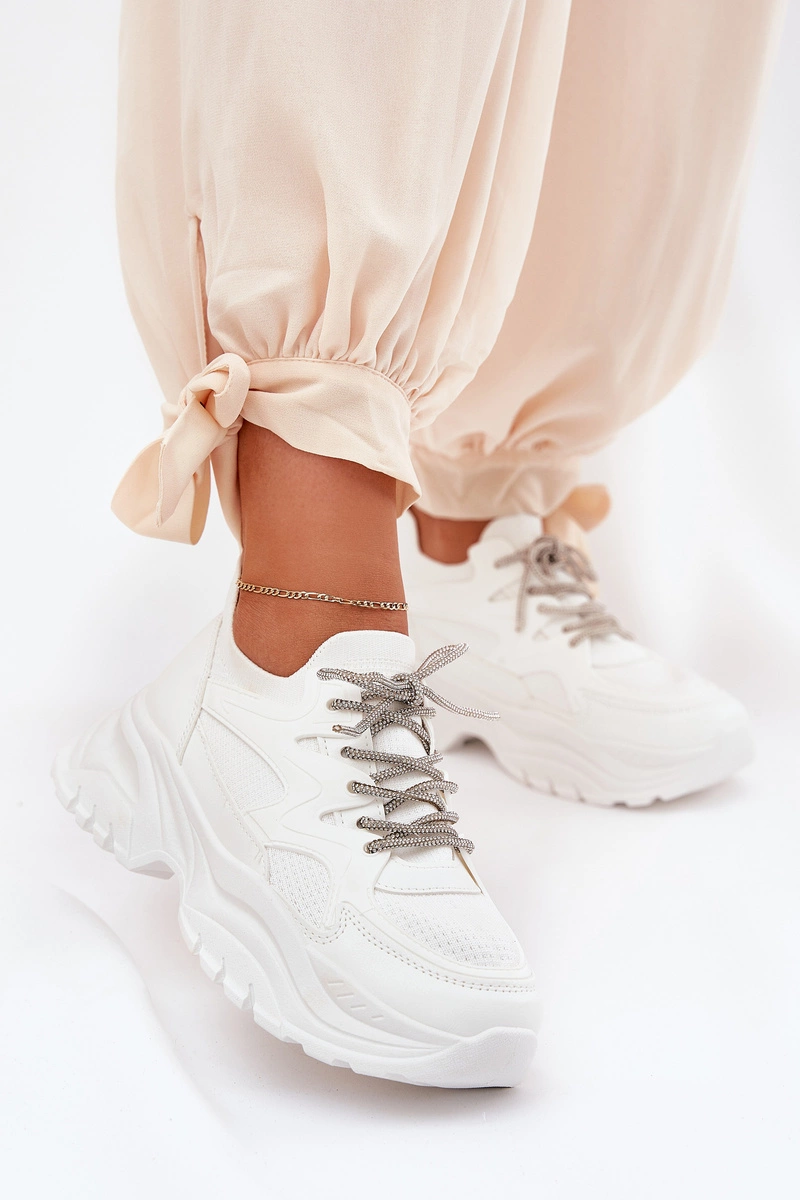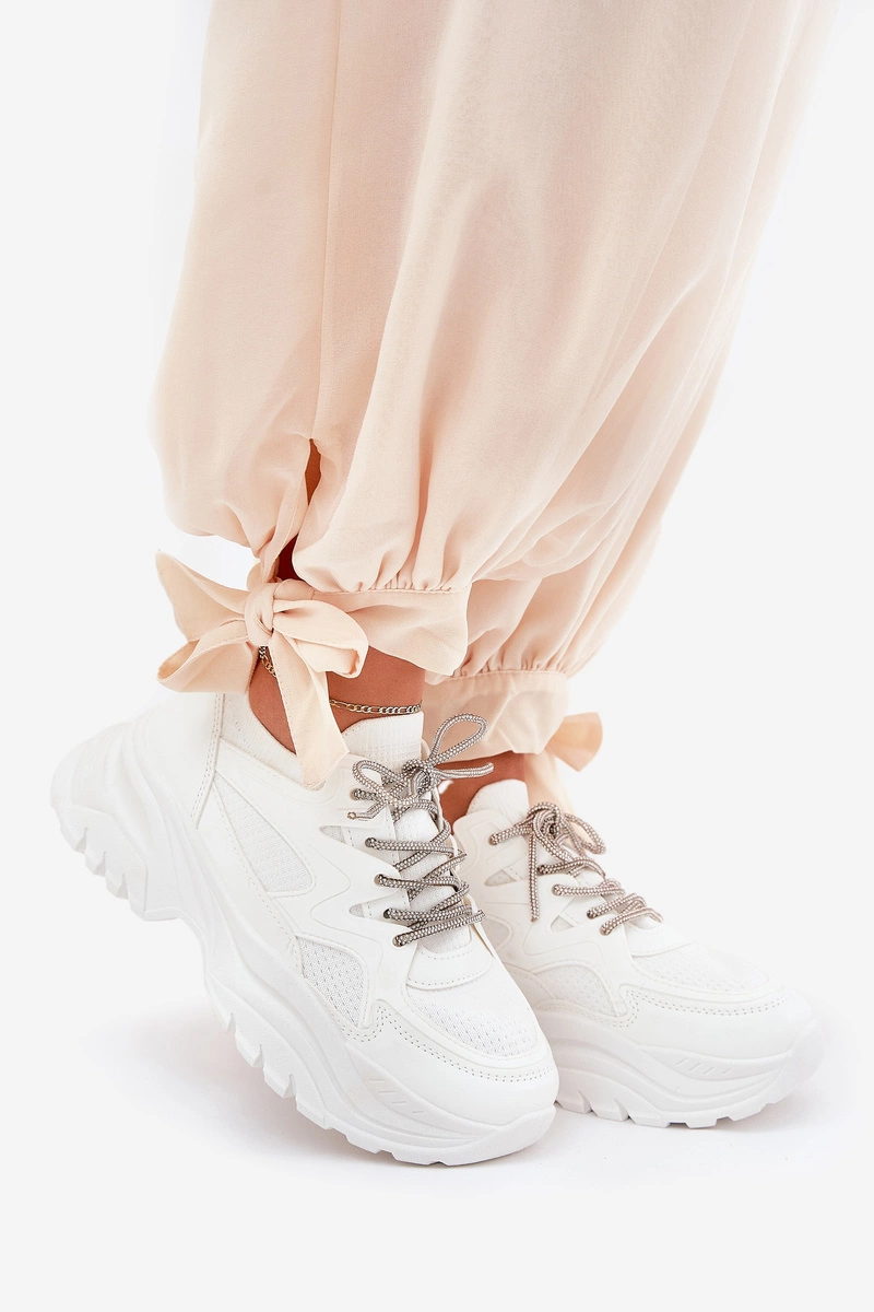 Sneakersy Damskie Na Platformie Ozdobnym Sznurowaniem Białe Evalianne