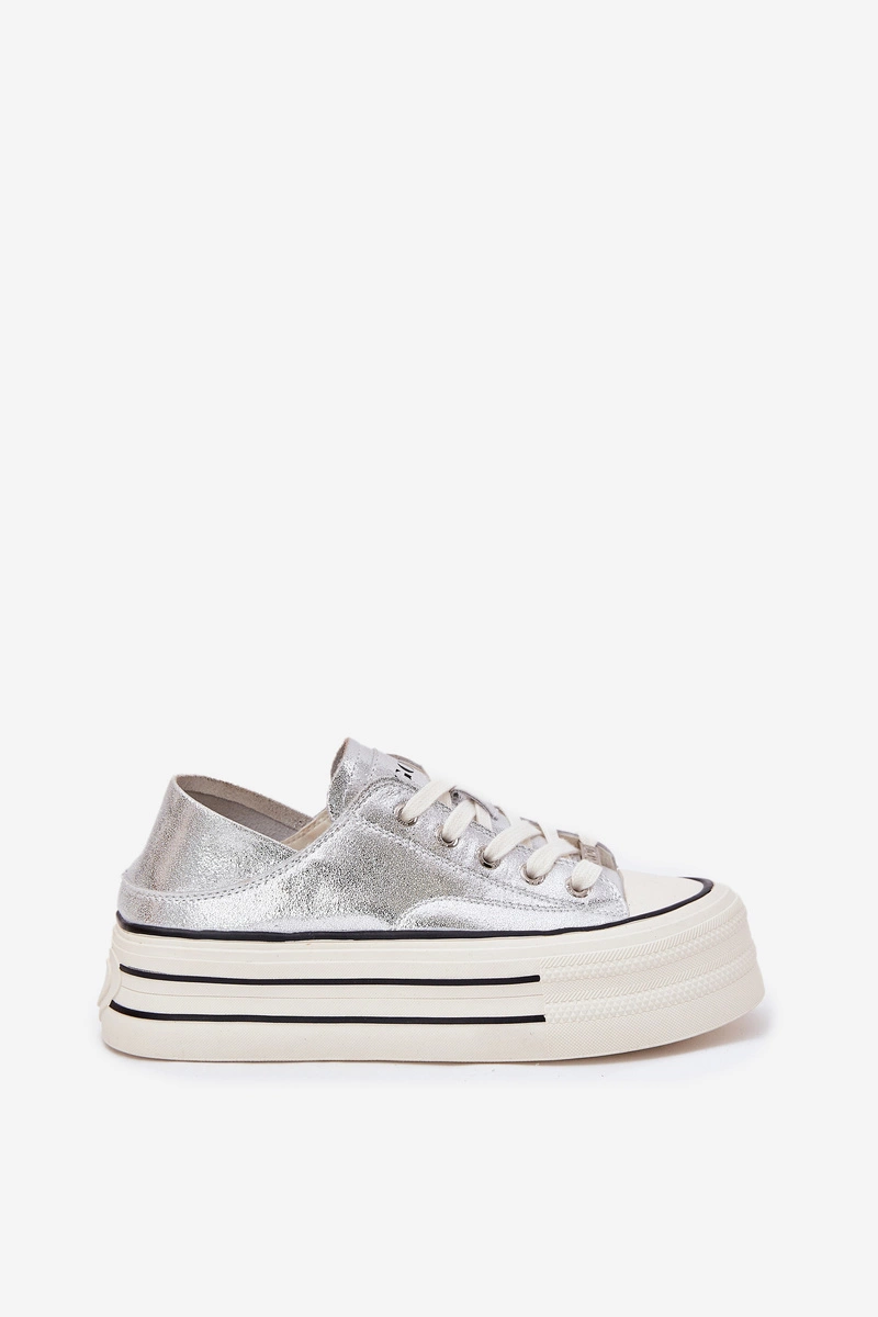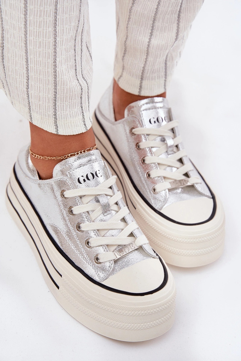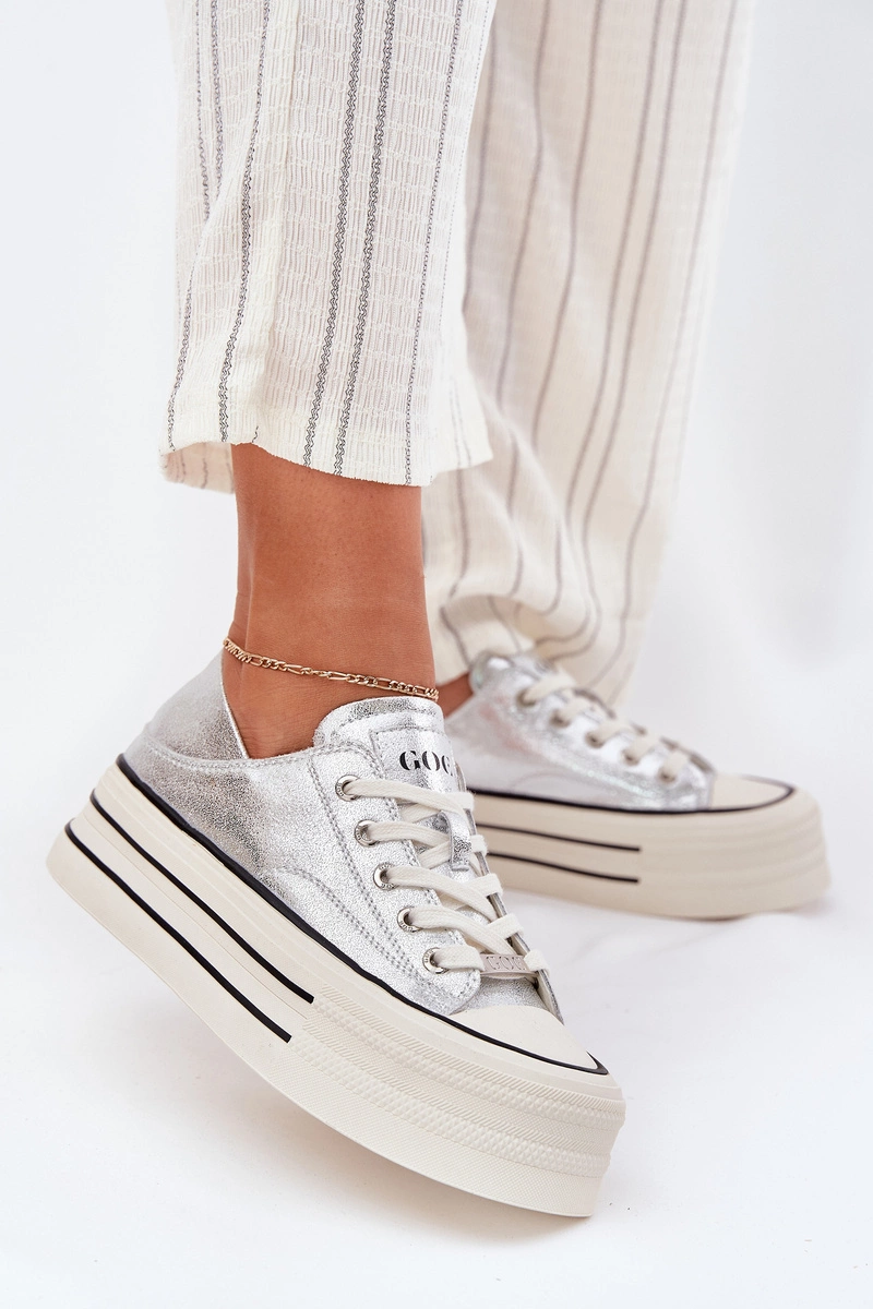 Skórzane Trampki Damskie Na Platformie GOE RR2N4108 Srebrne