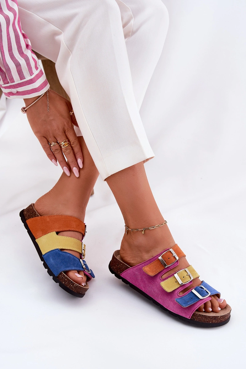 Zamszowe Klapki Damskie Z Klamrami Panto Fino RR267033 Fuksja