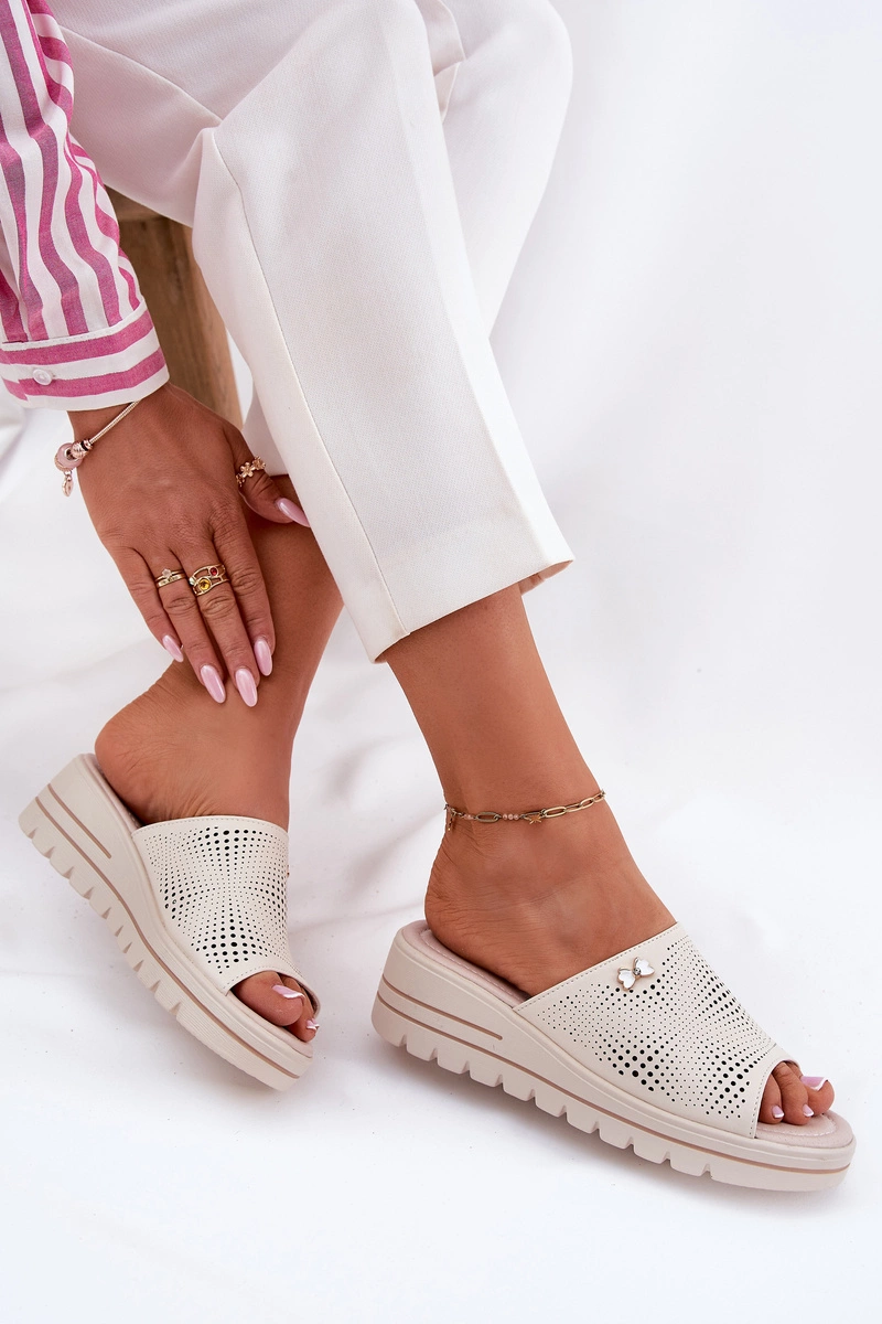 Skórzane Klapki Damskie Na Koturnie Vinceza 41477 Beżowe