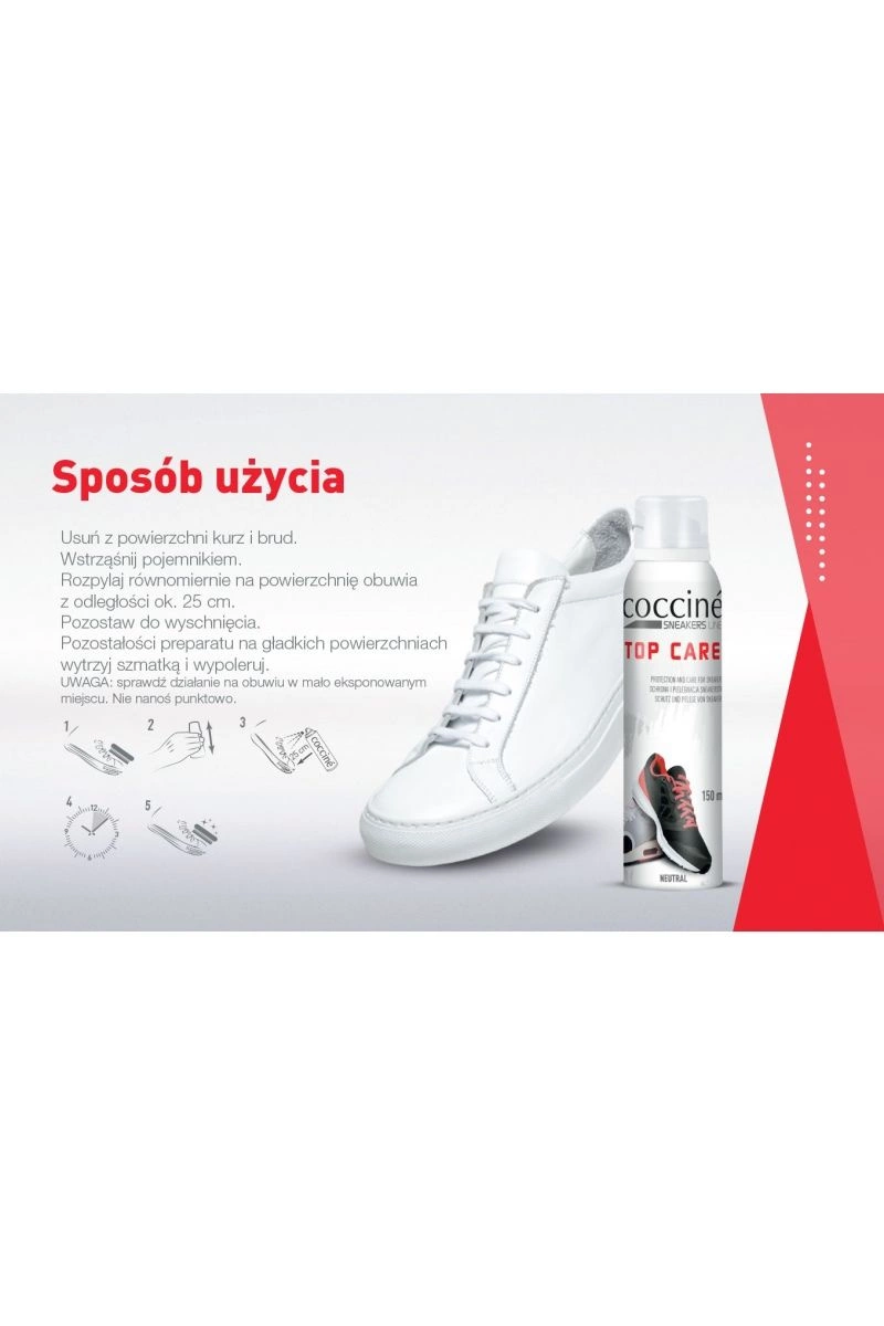Top Care uniwersalny spray do obuwia typu sneakers. Przeznaczony do skóry naturalnej, eco-skóry, nubuku, siateczki mesh i obuwia z połączonych w/w materiałów. Odświeża wygląd, pielęgnuje i chroni cholewki. Nabłyszcza skóry gładkie. Na nubuku i siateczce przywraca ich żywy odcień.