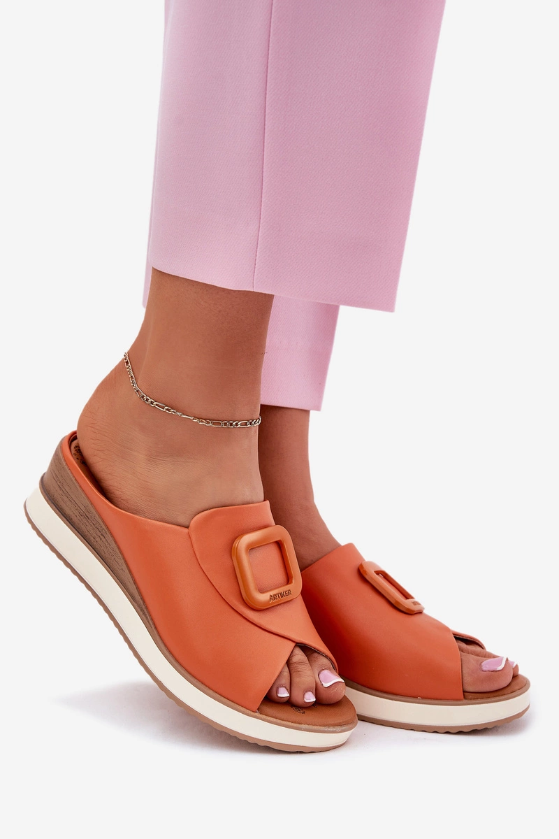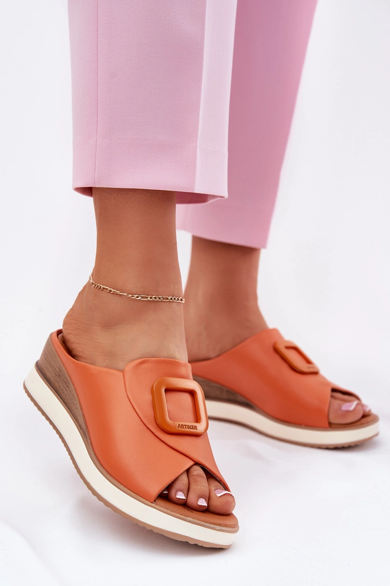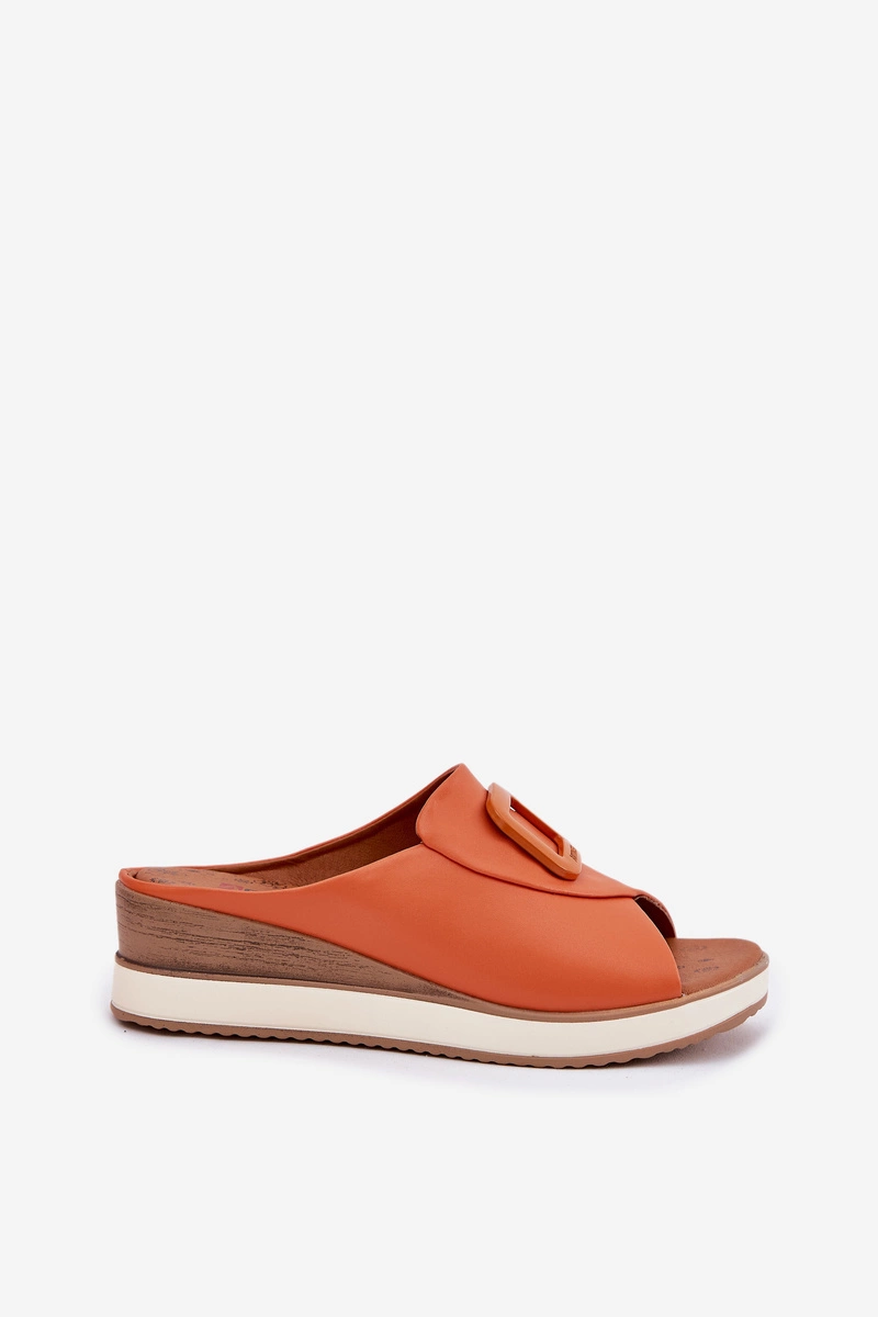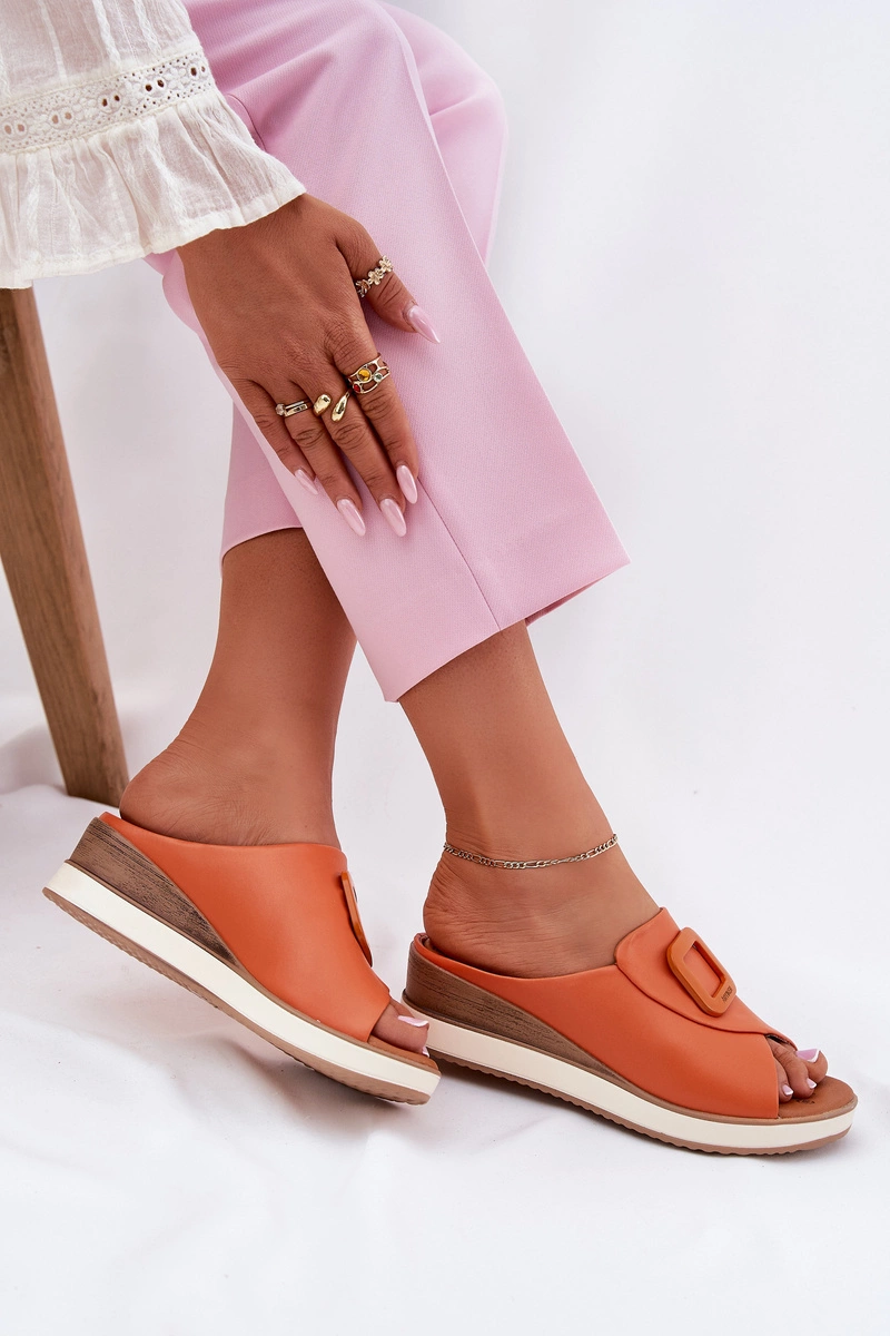 Damskie klapki wykonane z naturalnej skóry to elegancka propozycja na cieplejsze dni. Osadzone na koturnie, zapewniają stabilność i wygodę przez cały dzień. Z przodu butów znajduje się subtelny ozdobny detal, który nadaje im wyjątkowego charakteru. Miękka wkładka dba o komfort noszenia, a stylowy fason sprawia, że klapki będą doskonałym uzupełnieniem letnich stylizacji. Przy wyborze rozmiaru prosimy sugerować się tabelą rozmiarów.