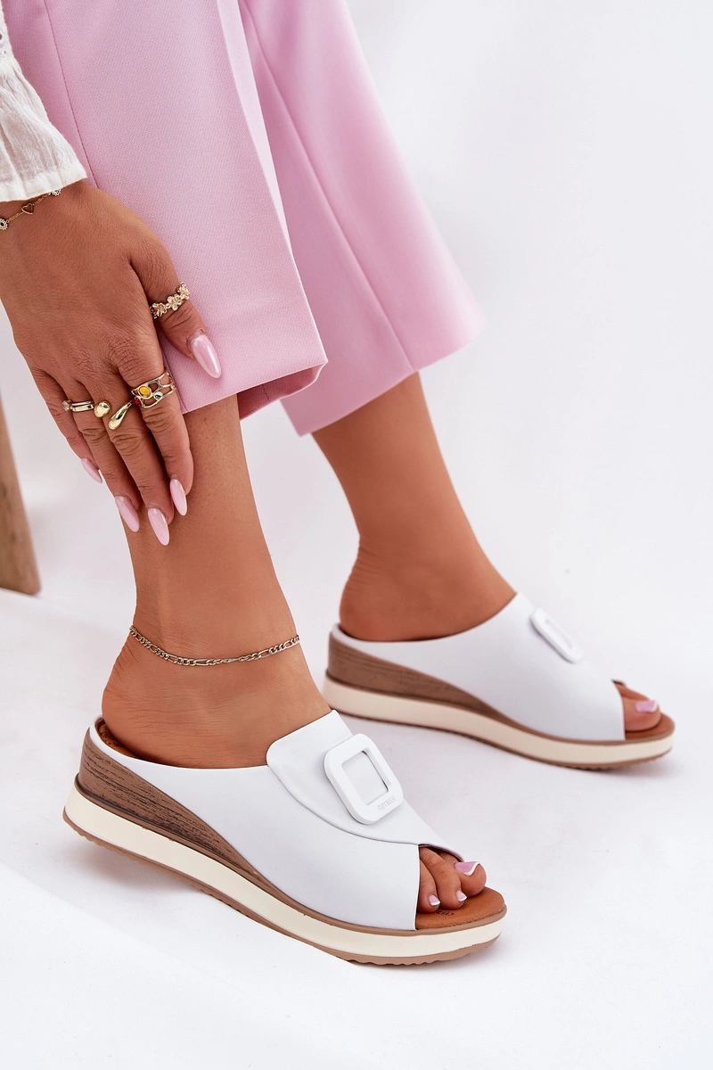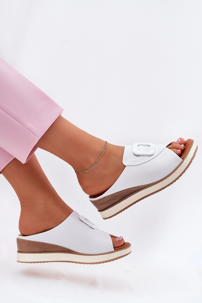 Damskie klapki wykonane z naturalnej skóry to elegancka propozycja na cieplejsze dni. Osadzone na koturnie, zapewniają stabilność i wygodę przez cały dzień. Z przodu butów znajduje się subtelny ozdobny detal, który nadaje im wyjątkowego charakteru. Miękka wkładka dba o komfort noszenia, a stylowy fason sprawia, że klapki będą doskonałym uzupełnieniem letnich stylizacji. Przy wyborze rozmiaru prosimy sugerować się tabelą rozmiarów.