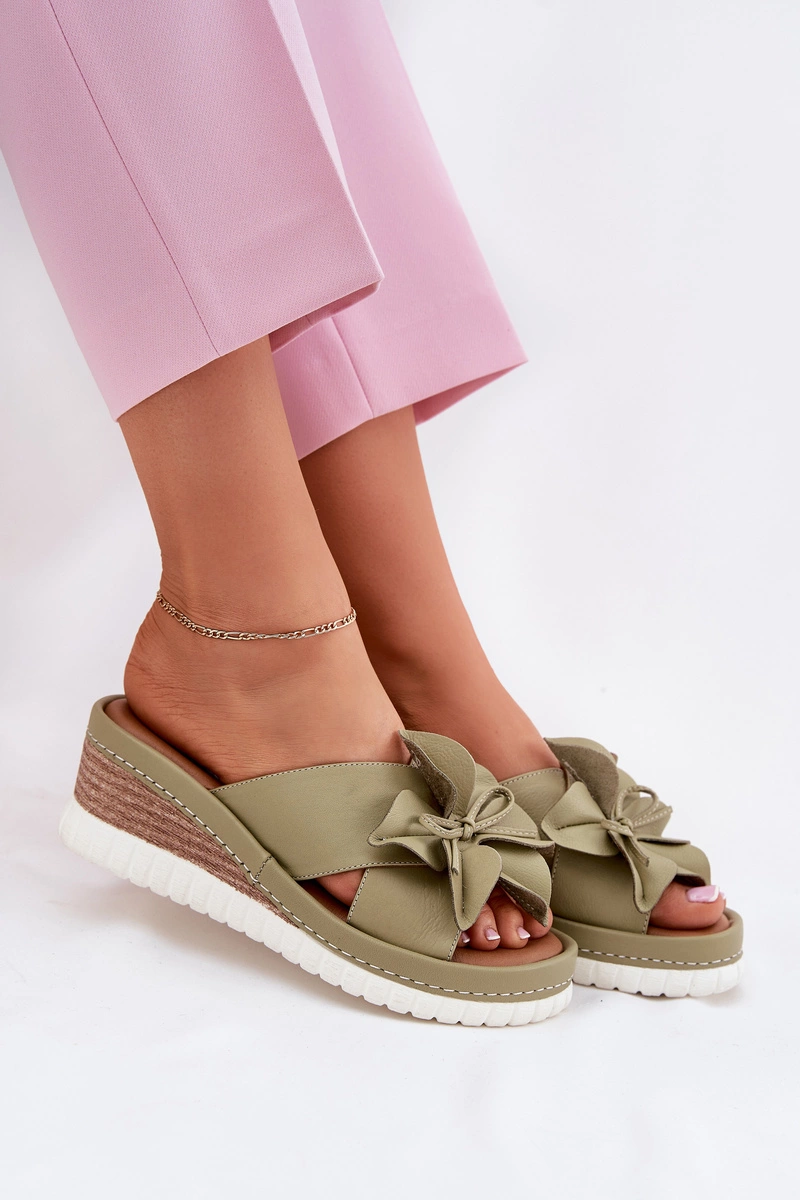 Skórzane Klapki Damskie Na Koturnie Z Ozdobnym Kwiatem Artiker 52C0503 Zielone