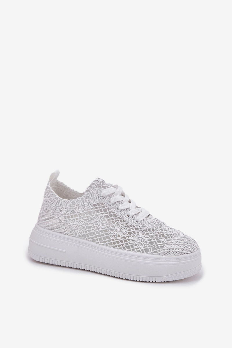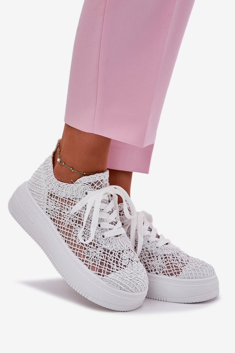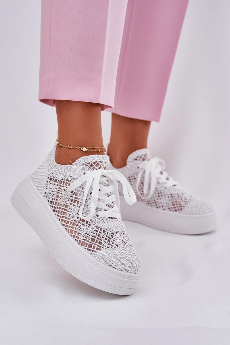 Sneakersy Damskie Na Platformie Z Szydełkową Cholewką Białe Mirietto