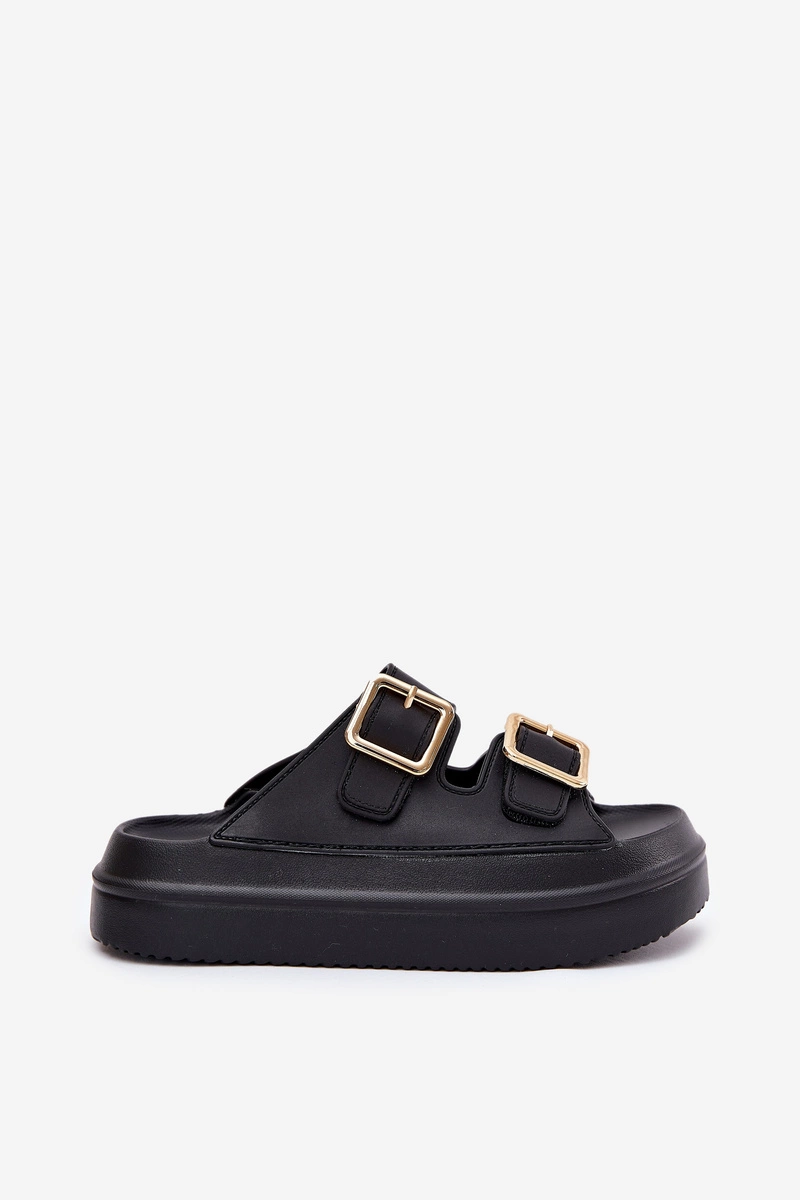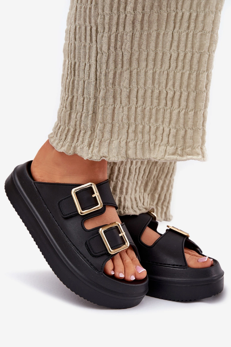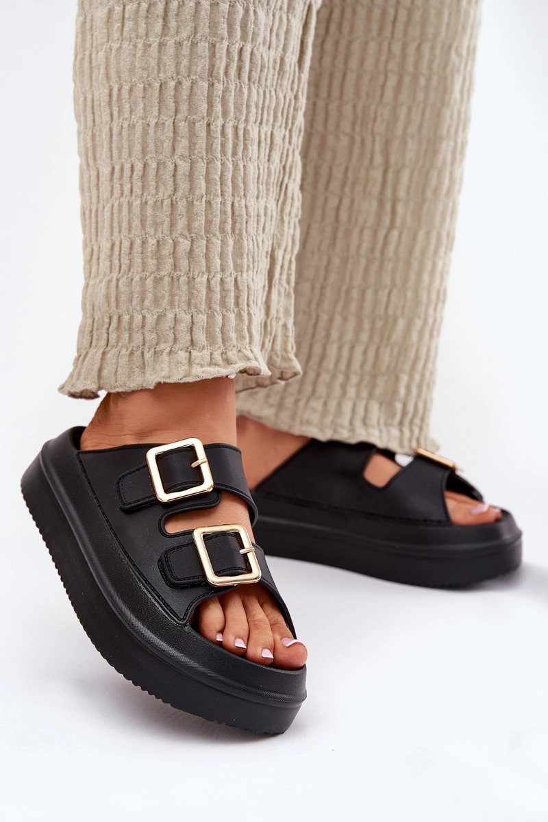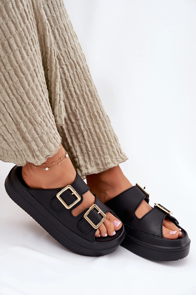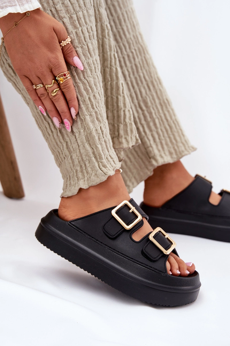Klapki Damskie Na Platformie Ze Złotymi Klamrami Czarne Zorila