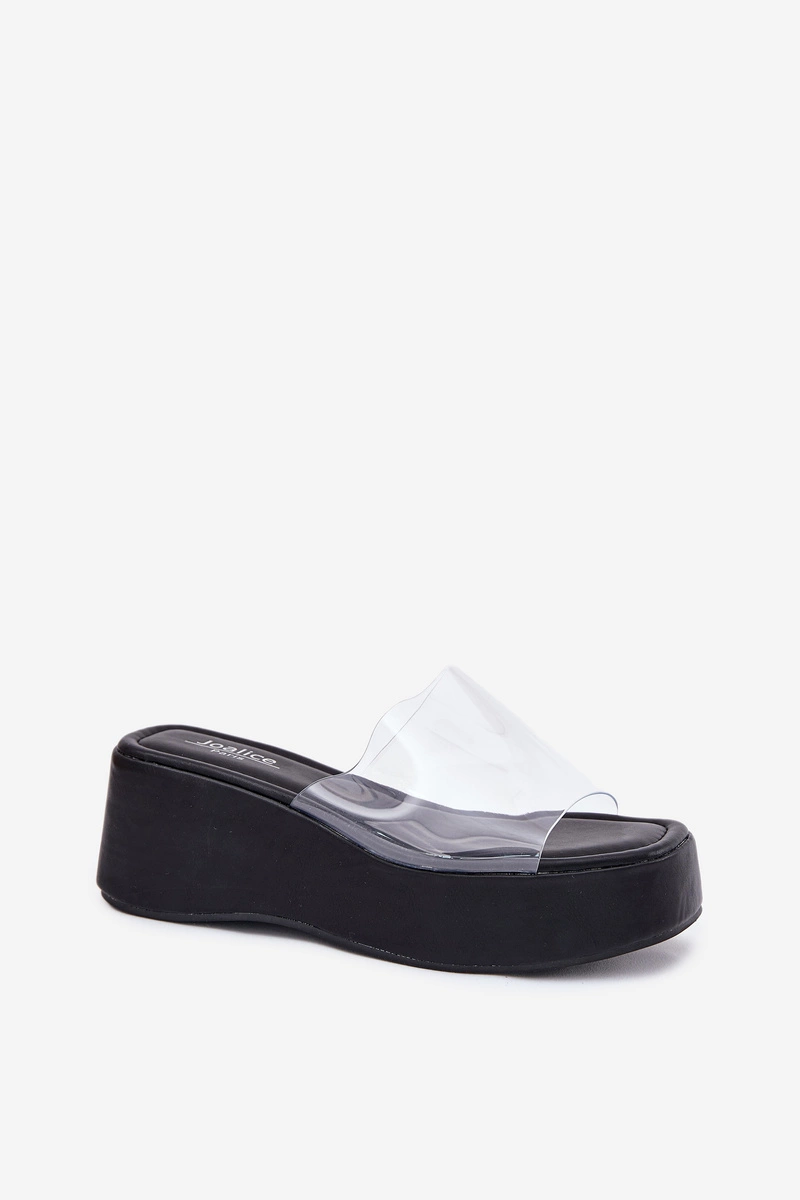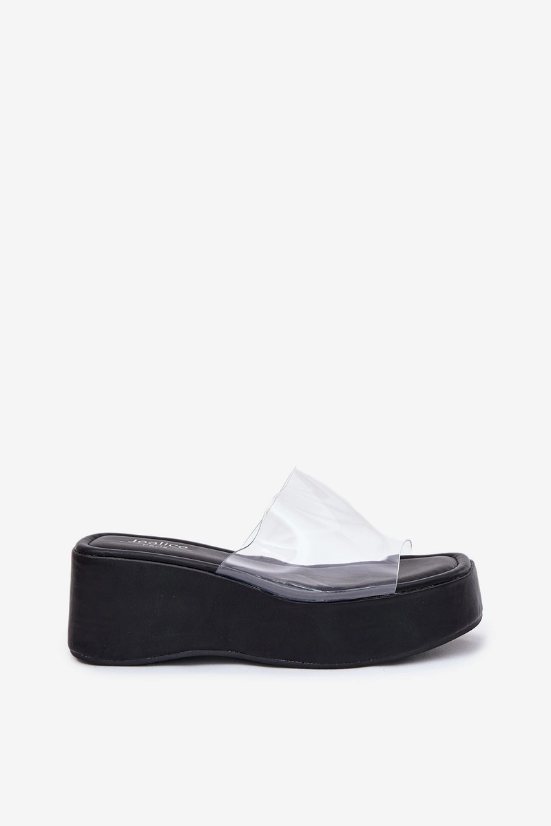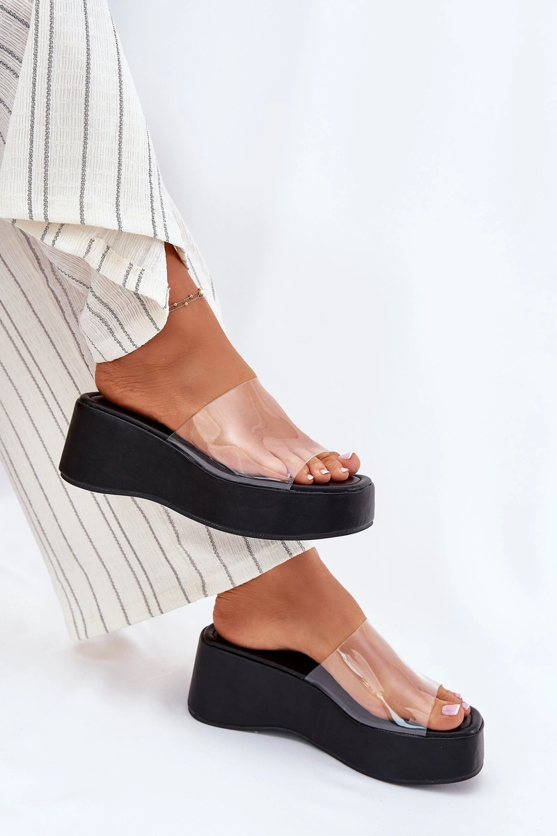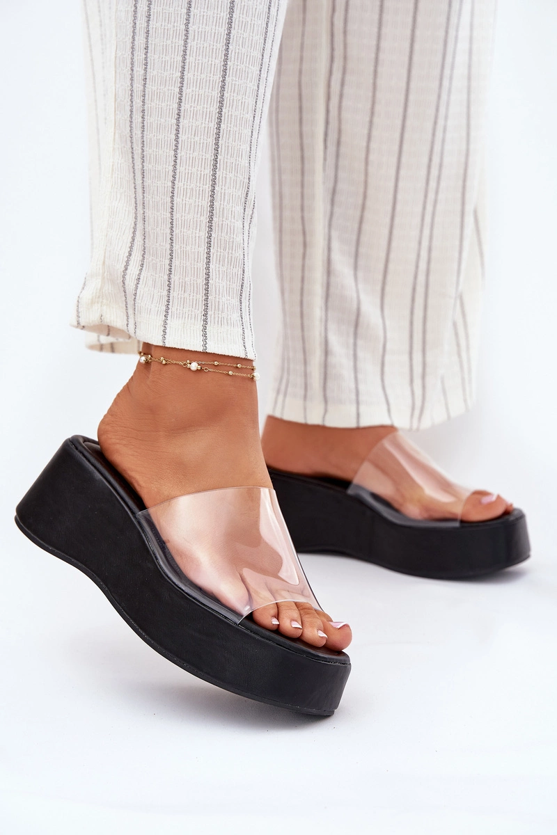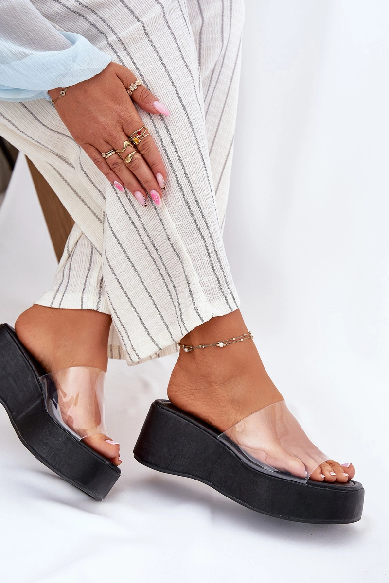 Klapki Damskie Z Transparentnym Paskiem Na Koturnie Czarne Meltiana