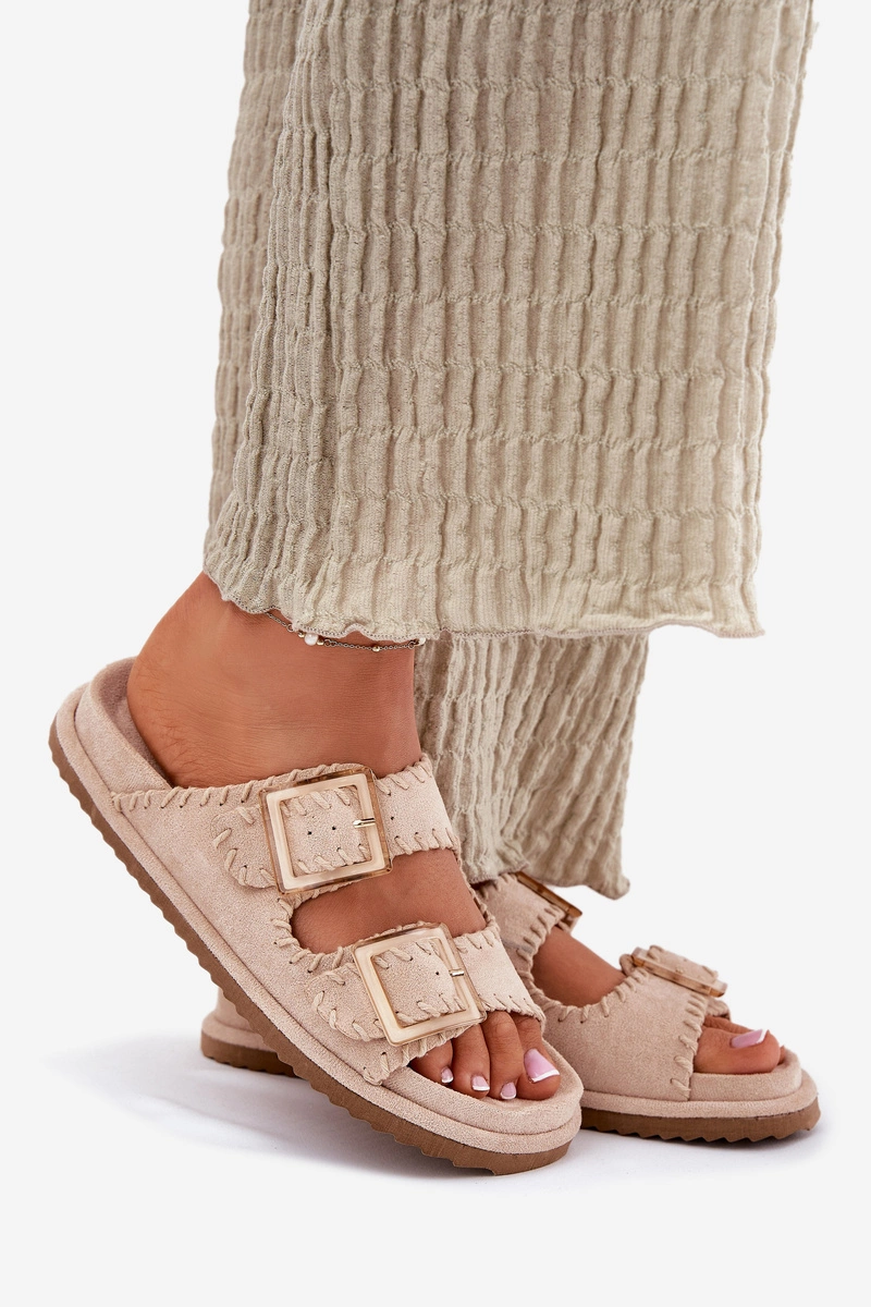 Klapki Damskie Z Klamrami I Ozdobnym Obszyciem Beżowe Visley