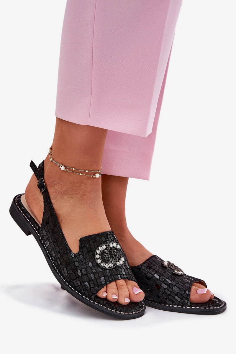 Skórzane Sandały Z Ozdobą Na Płaskim Obcasie S.Barski KV51-096 Czarne