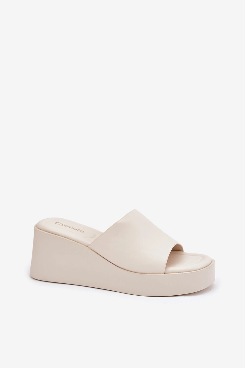 Klapki Damskie Na Koturnie Eko Skórzane Jasnobeżowe Obenae