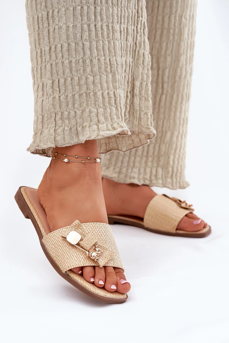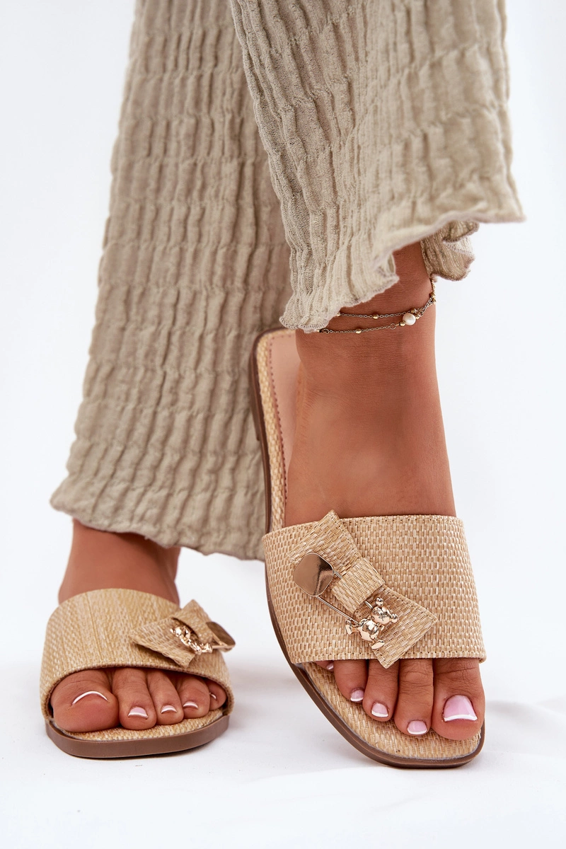 Klapki Damskie Na Płaskim Obcasie Z Kokardą Beżowe Sallariela