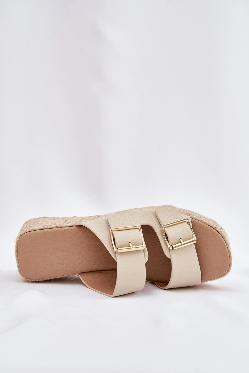 Klapki Damskie Na Koturnie Z Plecionką I Klamrami Beżowe Pasinea