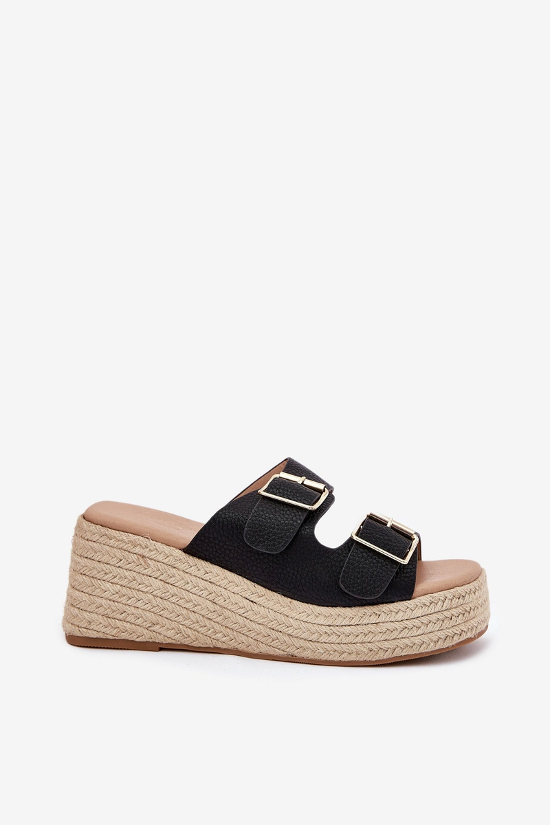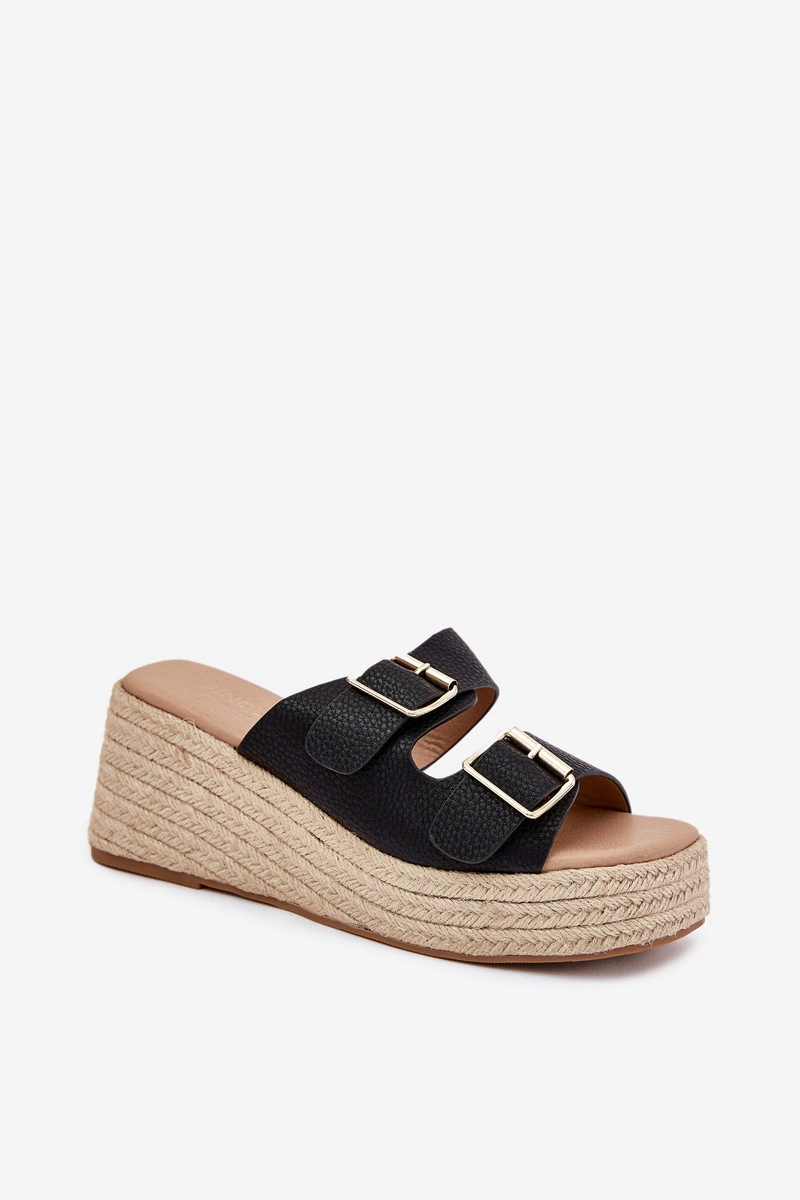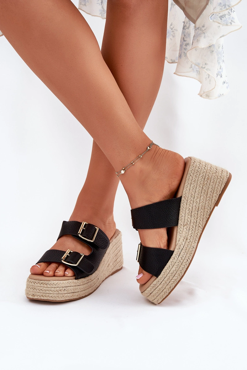 Klapki Damskie Na Koturnie Z Plecionką I Klamrami Czarne Pasinea