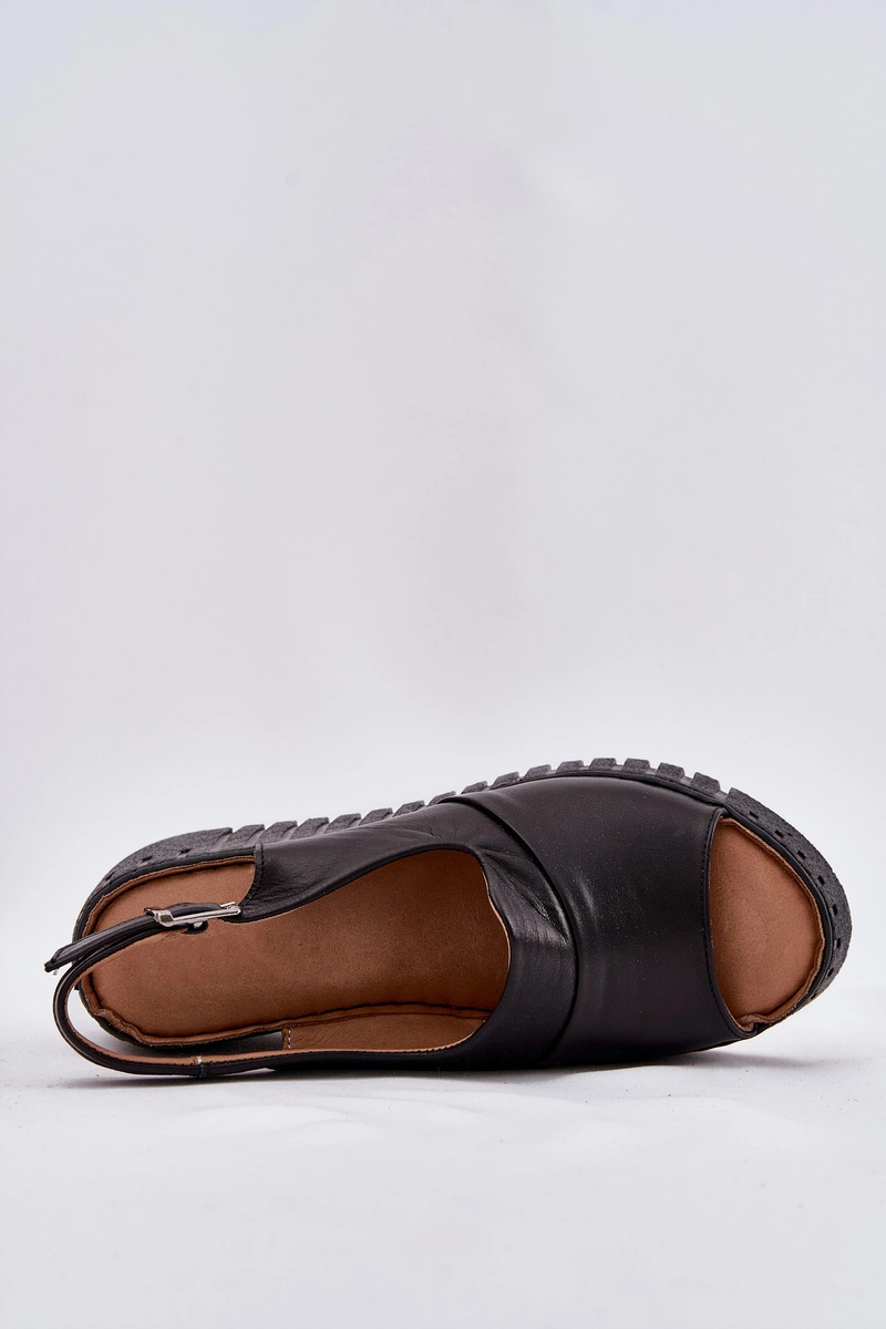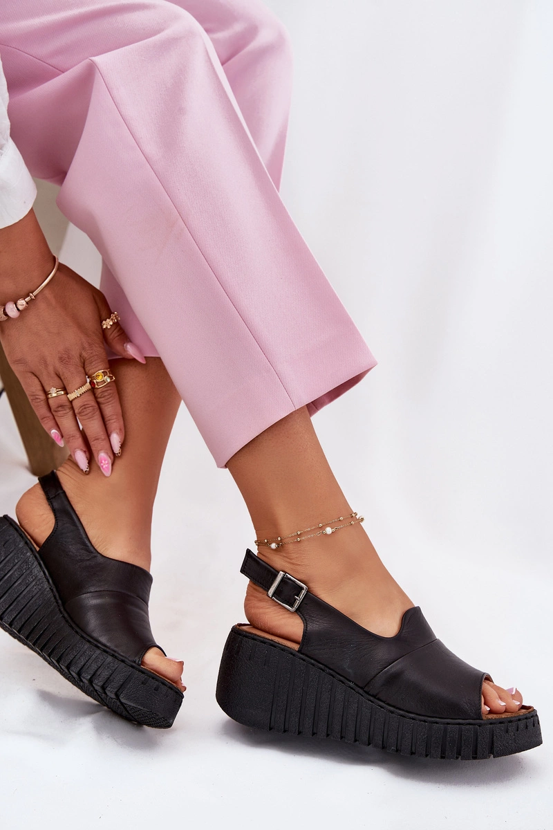 Sandały damskie z naturalnej skóry to elegancka i wygodna propozycja na letnie dni. Model ten zapinany jest na klamrę z regulowanym paskiem, co pozwala na idealne dopasowanie do stopy. Buty osadzone są na koturnie i platformie ze żłobieniami, co zapewnia stabilność oraz komfort przez cały dzień. Dodatkowo bardzo miękka wkładka sprawia, że każdy krok jest lekki i wygodny. To połączenie stylu, komfortu i funkcjonalności, które doskonale uzupełni Twoje letnie outfity. Przy wyborze rozmiaru prosimy sugerować się tabelą rozmiarów.