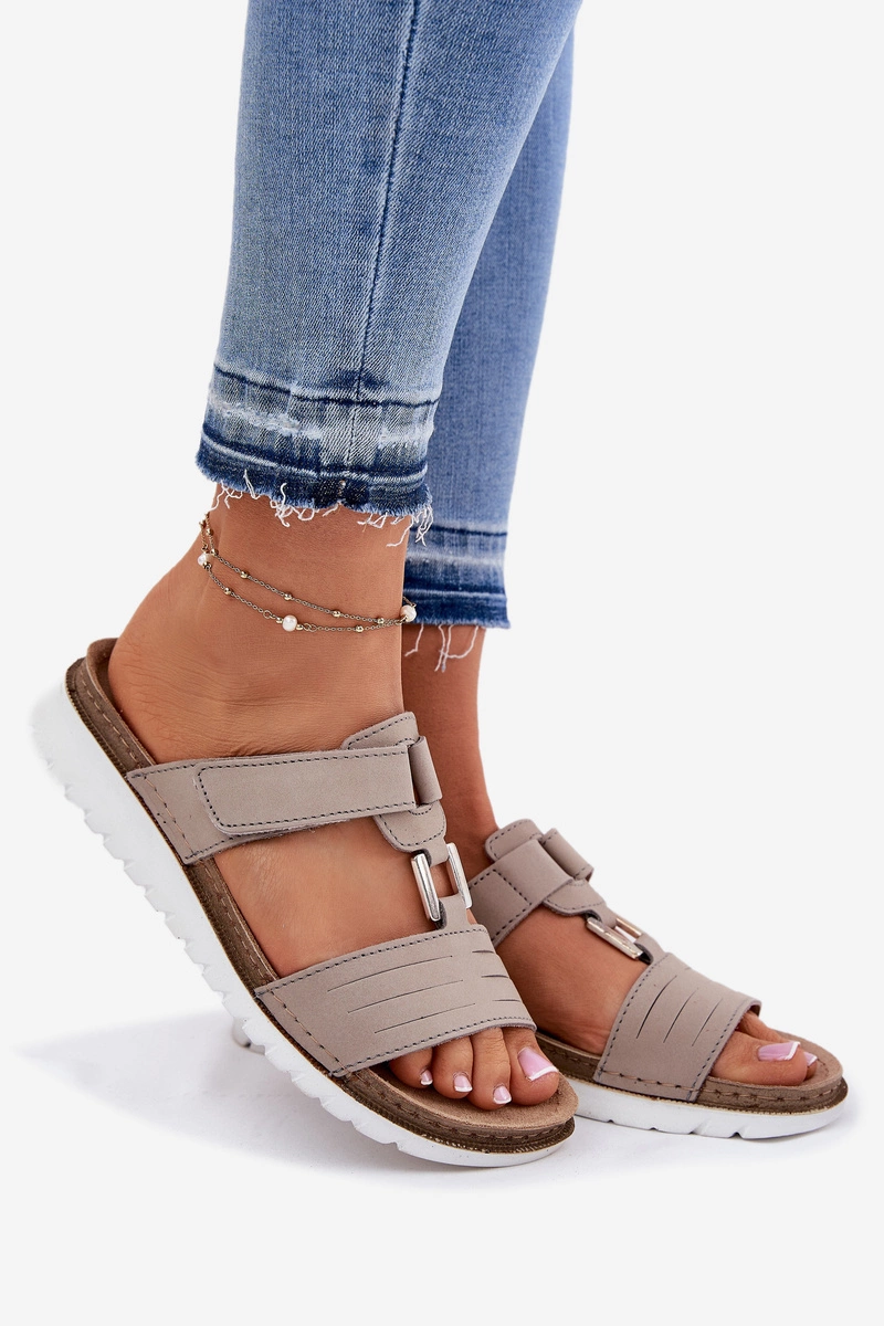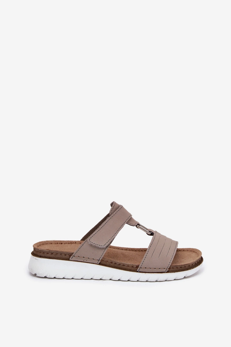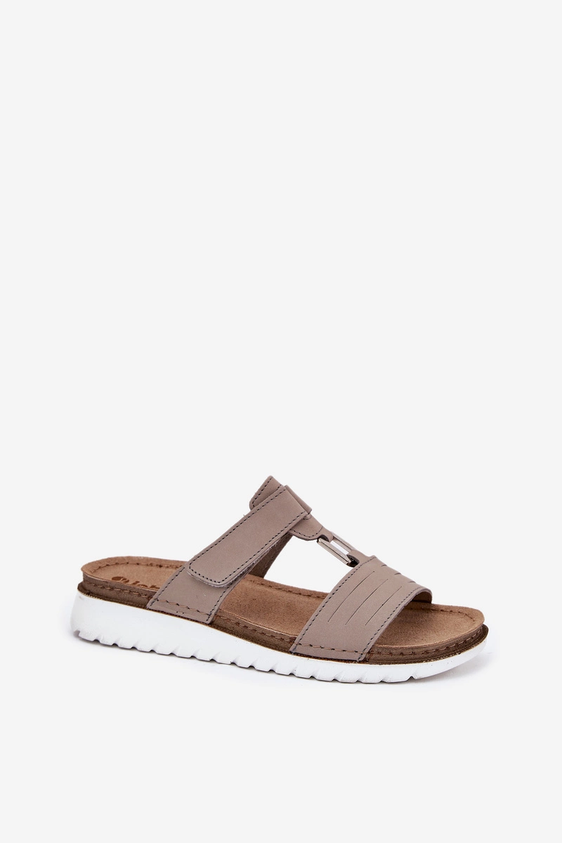 Klapki damskie od marki INBLU. Wykonane z wysokiej jakości eko skóry. Osadzone na delikatnym koturnie. Model ten posiada zapięcie na rzep, co zapewni doskonałe dopasowanie do tęgości stopy. Skórzana, profilowana wkładka dostosowuje się do anatomicznego kształtu stopy, zapewniając doskonałe dopasowanie i wygodę. Elastyczna podeszwa gwarantuje stabilność i sprężystość podczas chodzenia. Idealne do codziennych stylizacji, łączące modny wygląd z funkcjonalnością. Przy wyborze rozmiaru prosimy sugerować się tabelą rozmiarów.