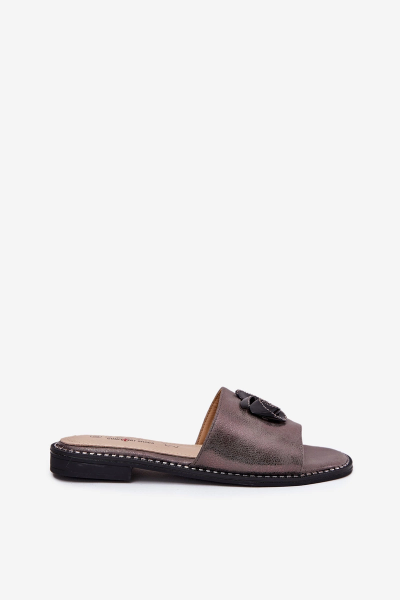 Klapki Damskie Na Płaskim Obcasie Z Ozdobnym Detalem KV51-007 Grafitowe