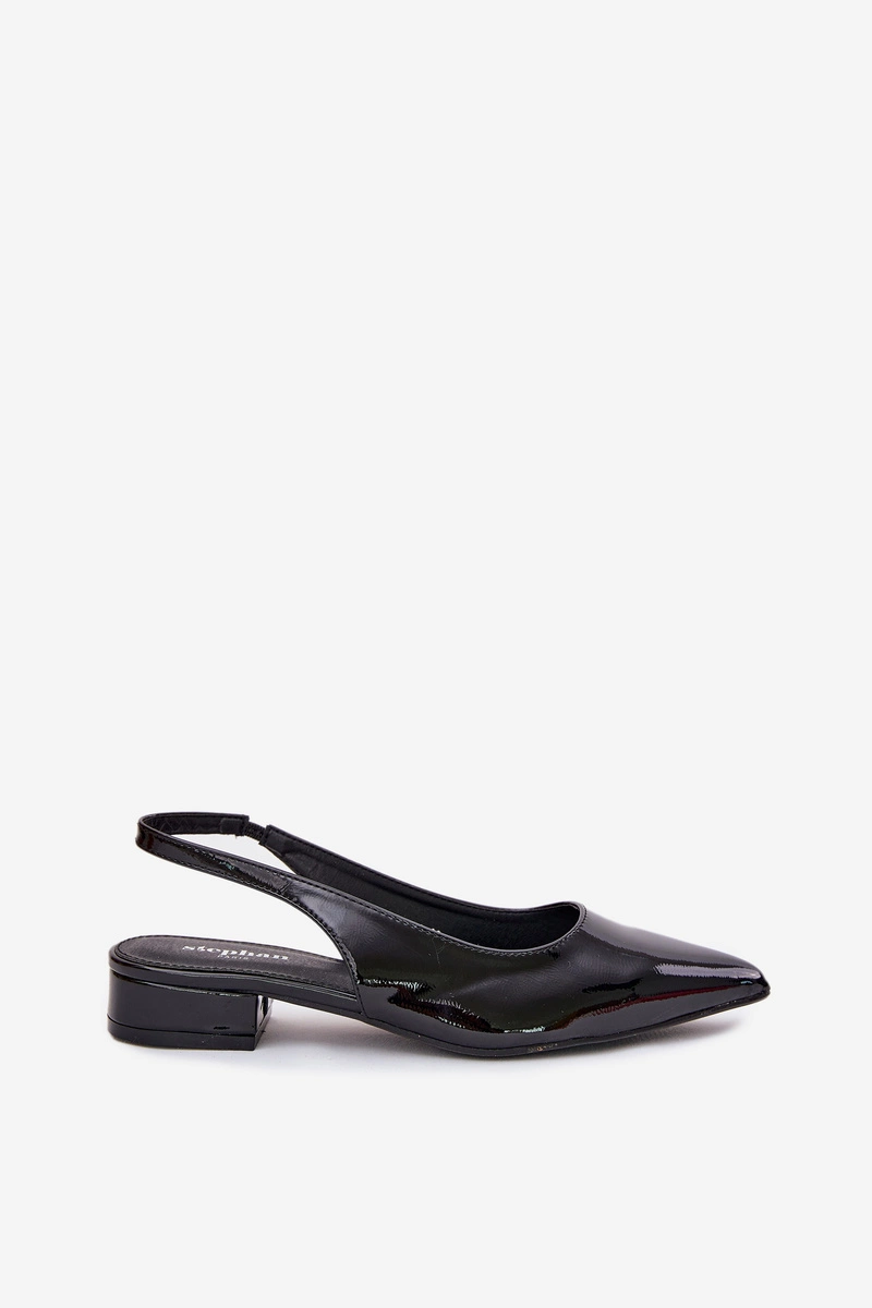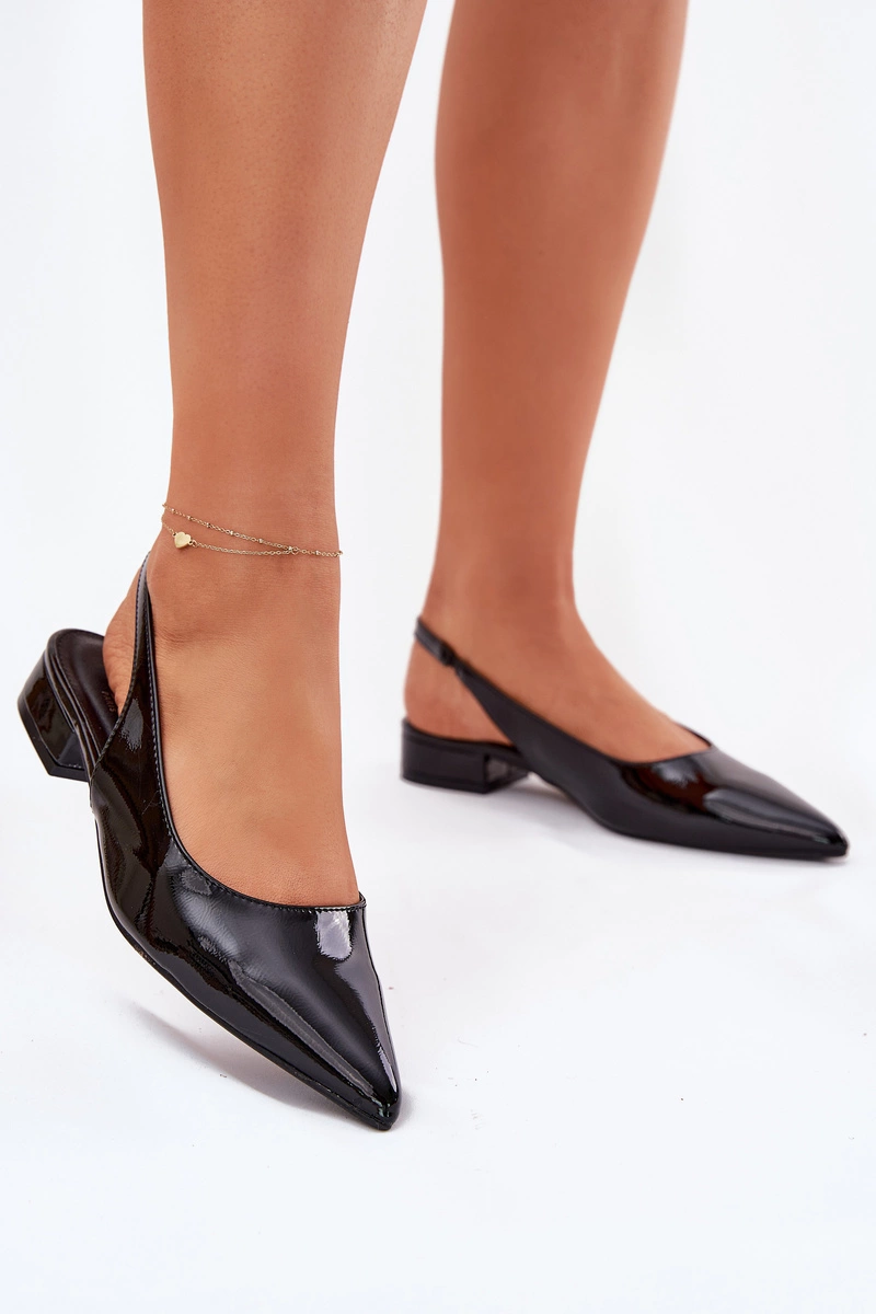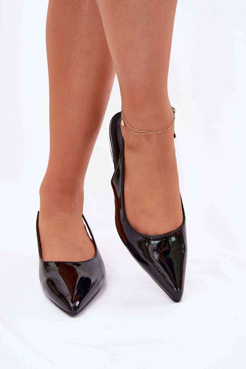 Te lakierowane baleriny na niskim klockowym obcasie to stylowa opcja, która świetnie łączy elegancję z wygodą. Dzięki szpiczastym noskom nogi wydają się dłuższe, a odkryta pięta dodaje im lekkości. Baleriny te będą idealnym wyborem zarówno na co dzień, jak i na bardziej oficjalne wyjścia. Podczas wyboru rozmiaru prosimy sugerować się tabelą rozmiarów.