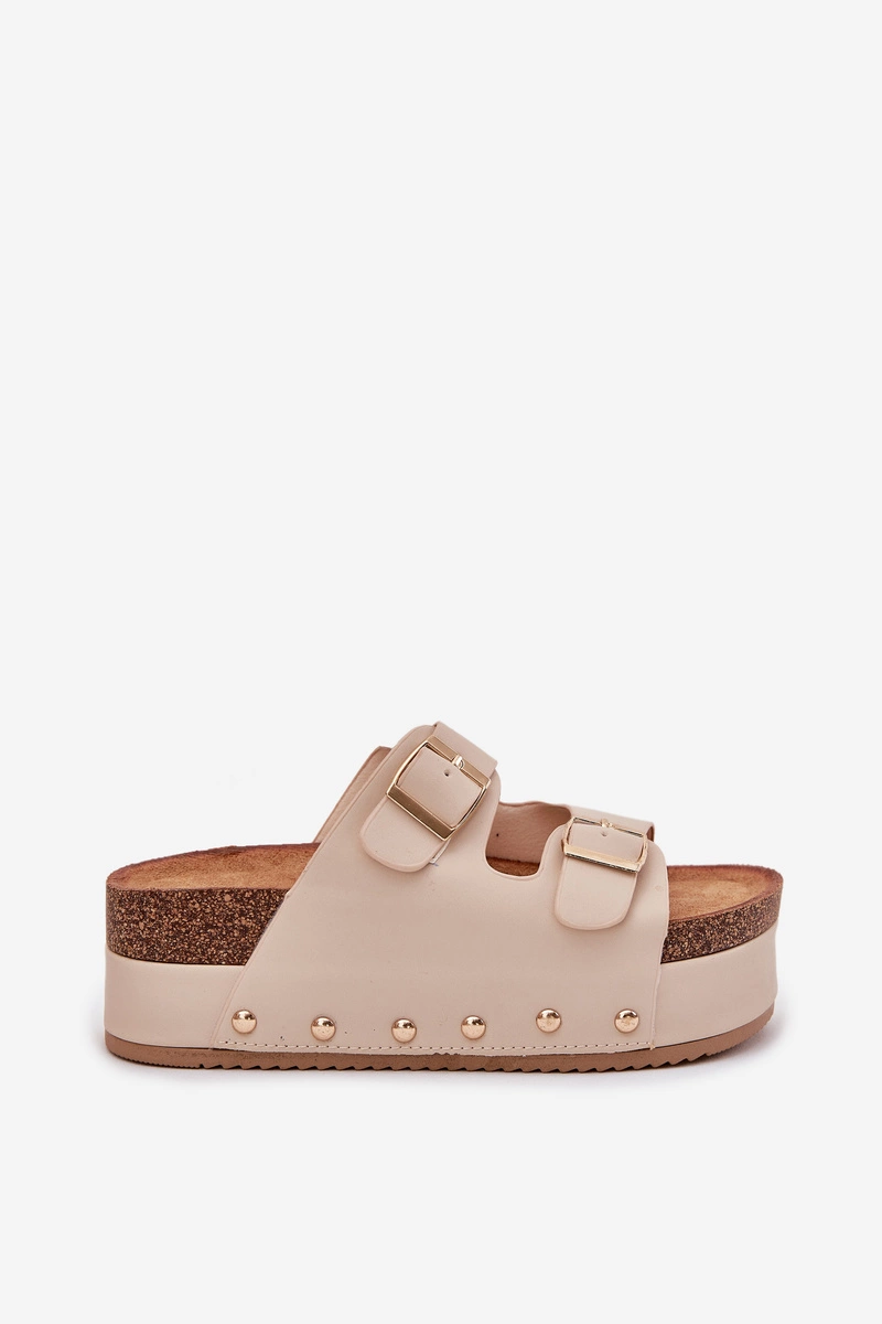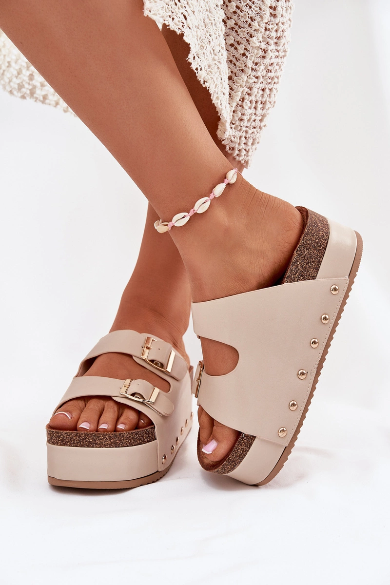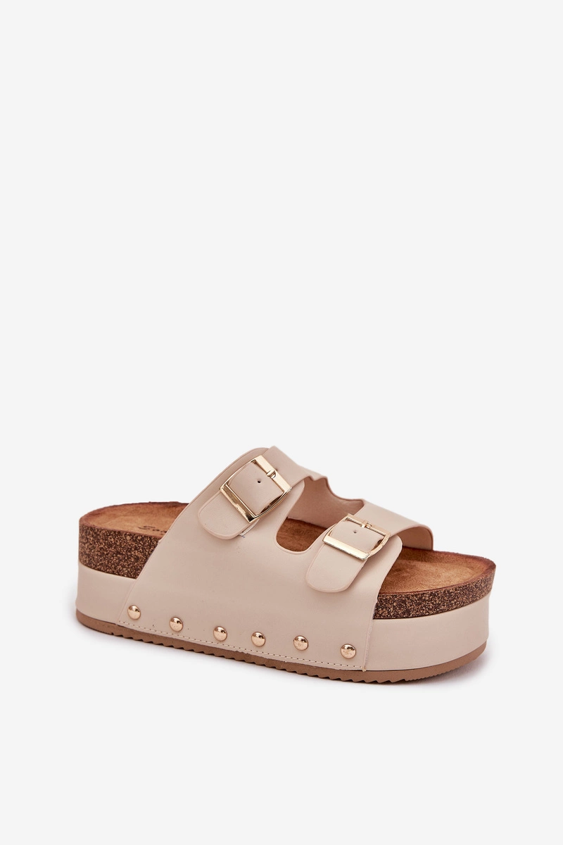 Klapki Damskie Z Klamrami Na Masywnej Platformie Beżowe Odisene