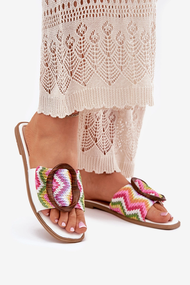 Klapki Damskie Płaskie Z Ozdobną Klamrą Białe Luwam