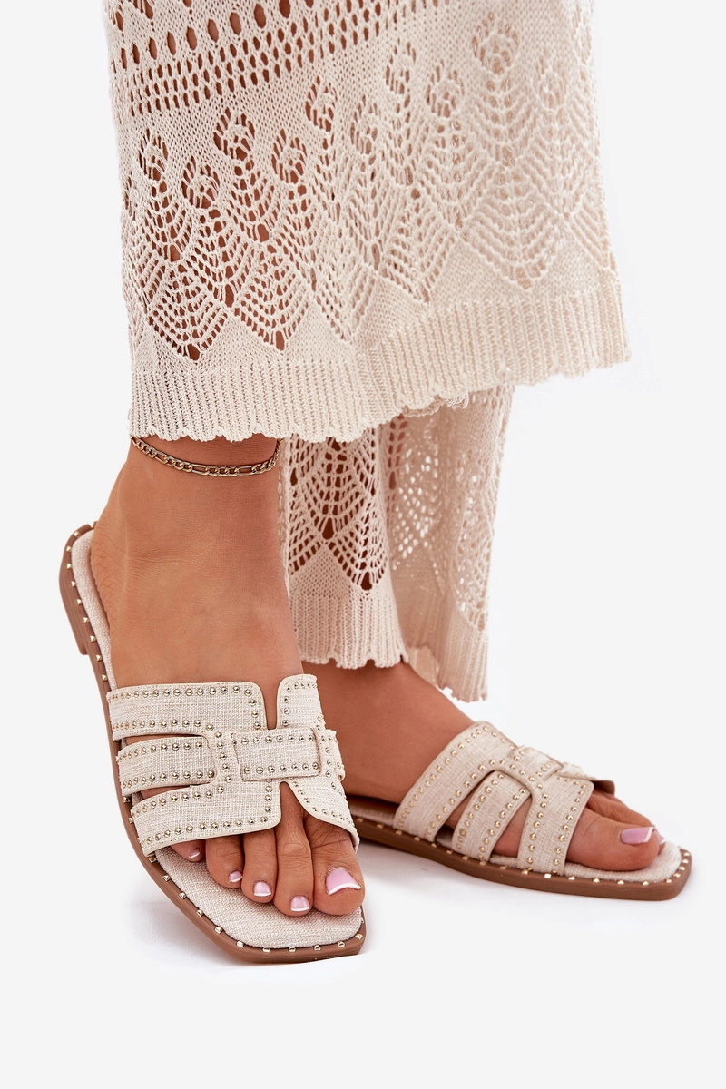 Zdobione Klapki Na Płaskim Obcasie Beżowe Anniles