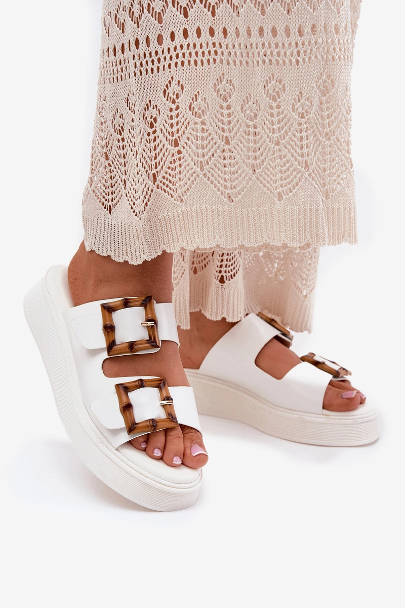 Eko Skórzane Klapki Damskie Na Platformie Z Klamrami Białe Xanivia