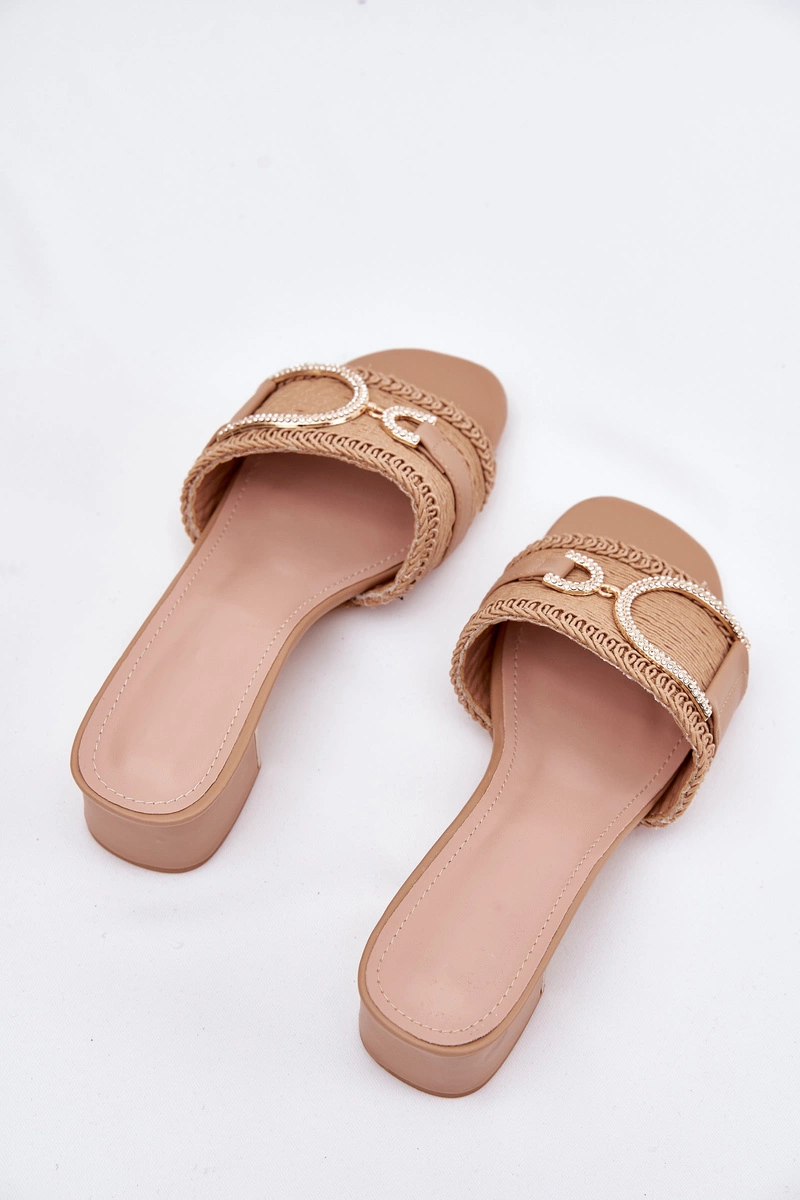 Damskie Klapki Na Obcasie Z Ozdobnym Detalem Ciemnobeżowe Julinemi