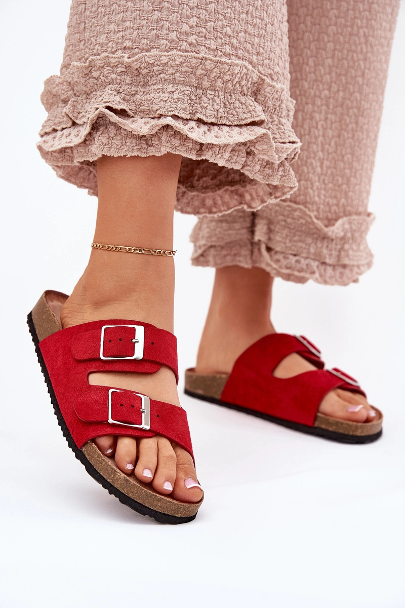 Klapki Damskie Na Korkowej Platformie Klamry Czerwone Evisolla