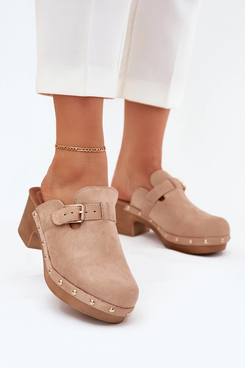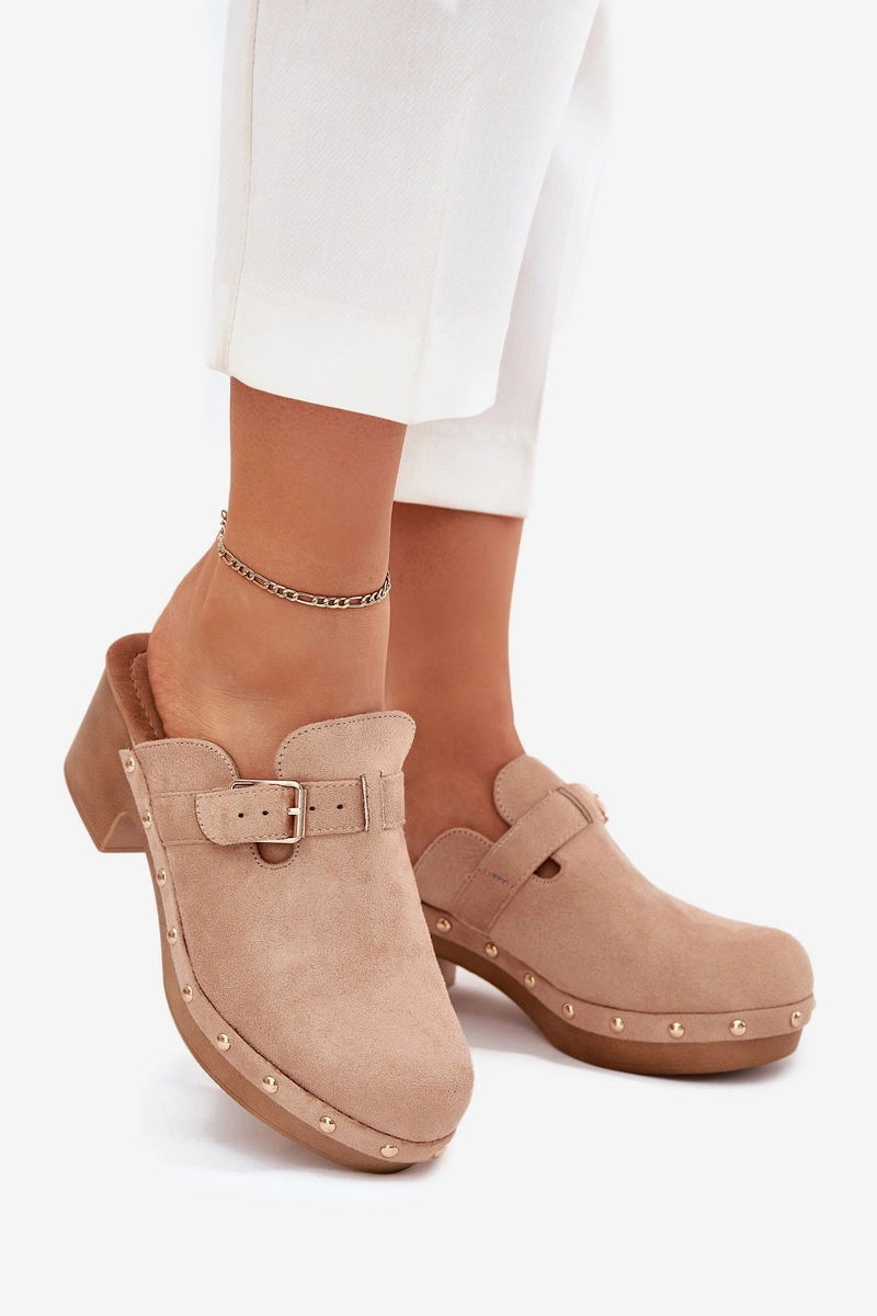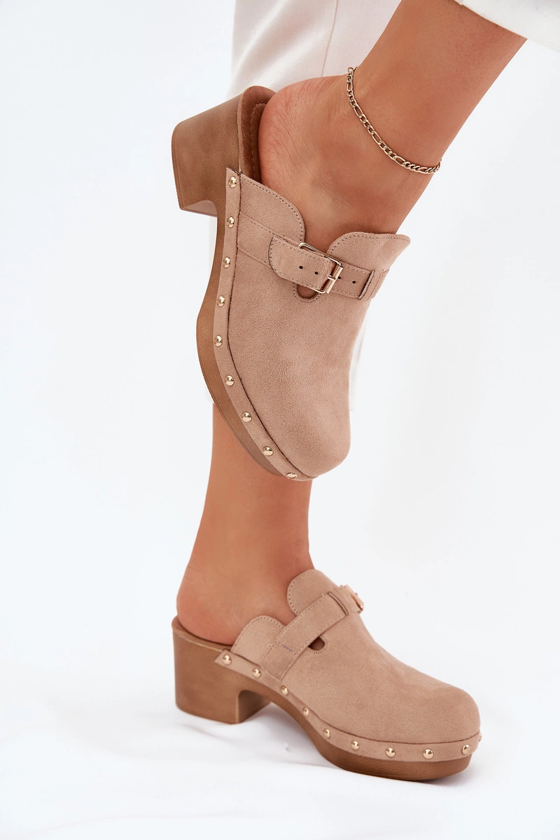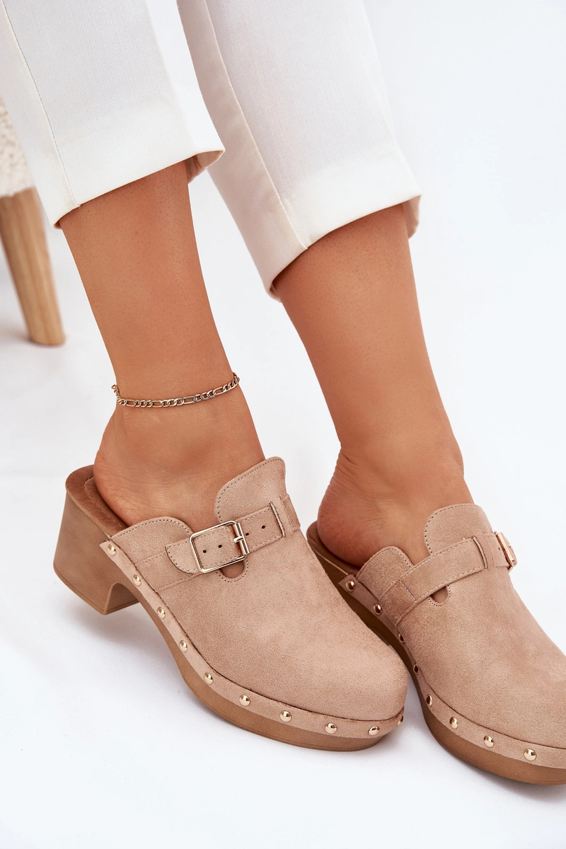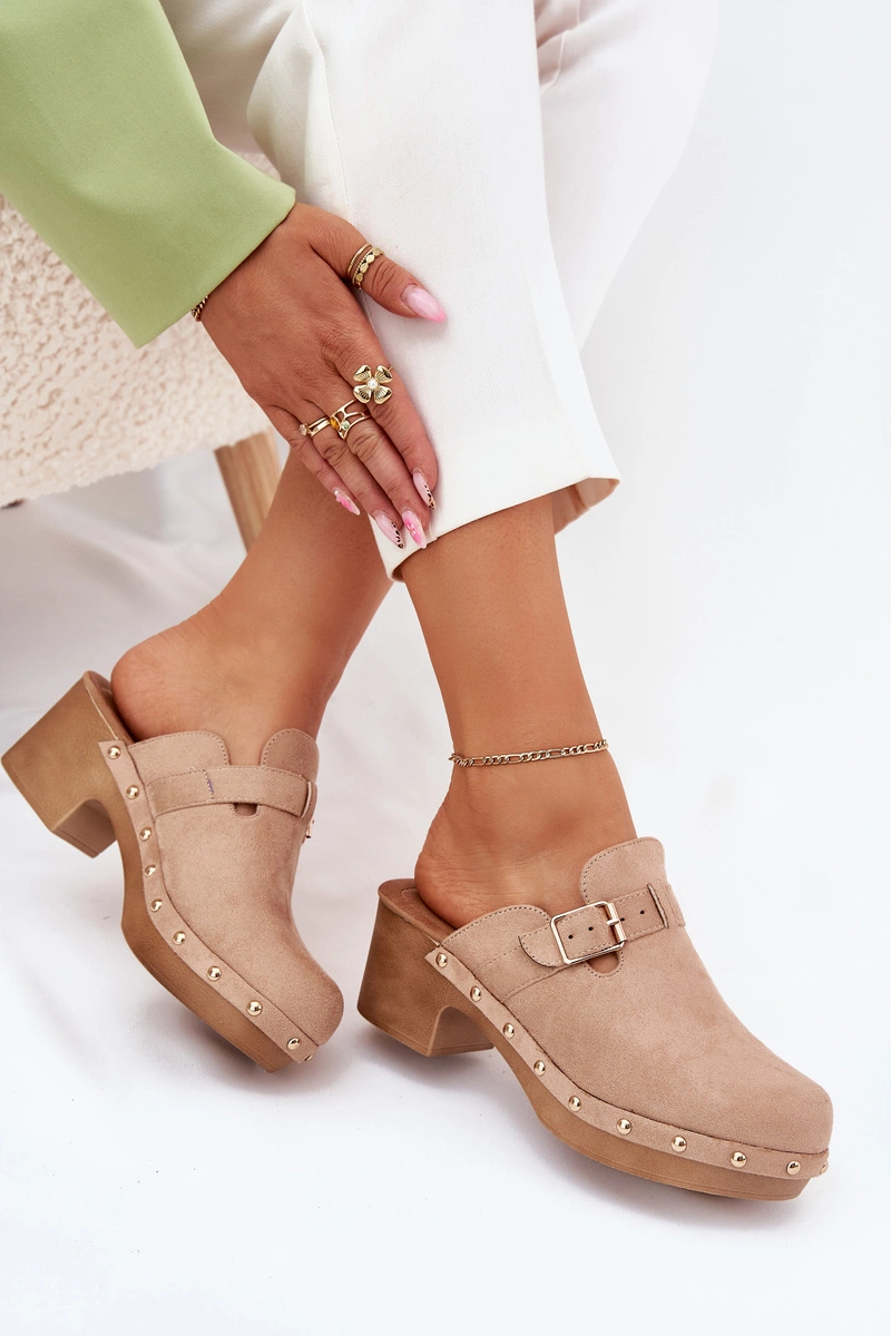 Klapki Chodaki Damskie Na Obcasie Z Klamrą Beżowe Veldexina